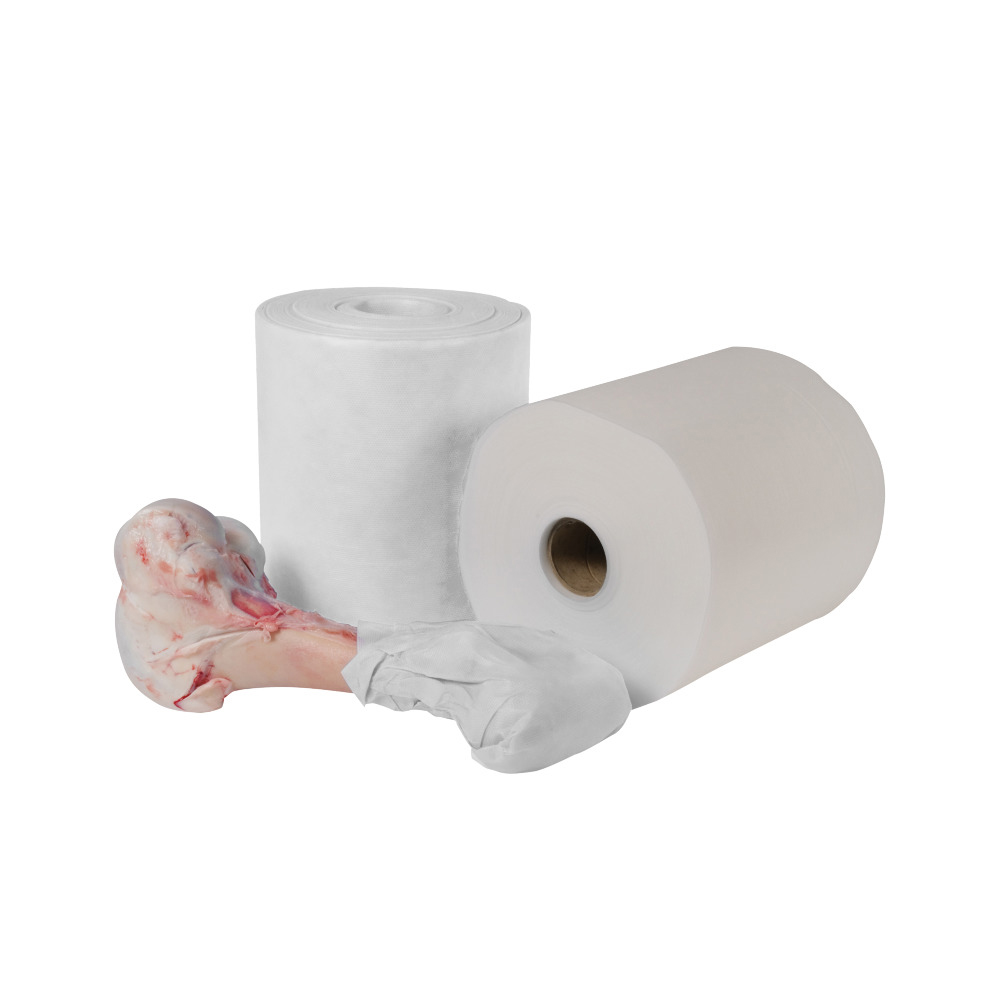 Dieses Knochenschutzleinen wird um spitze oder überstehende Knochenteile gewickelt und schützt den Vakuumbeutel vor Beschädigung und verhindert somit ″Luftzieher″. Rolle 23 cm breit x 91 m lang, Gewicht ca. 4,8 kg