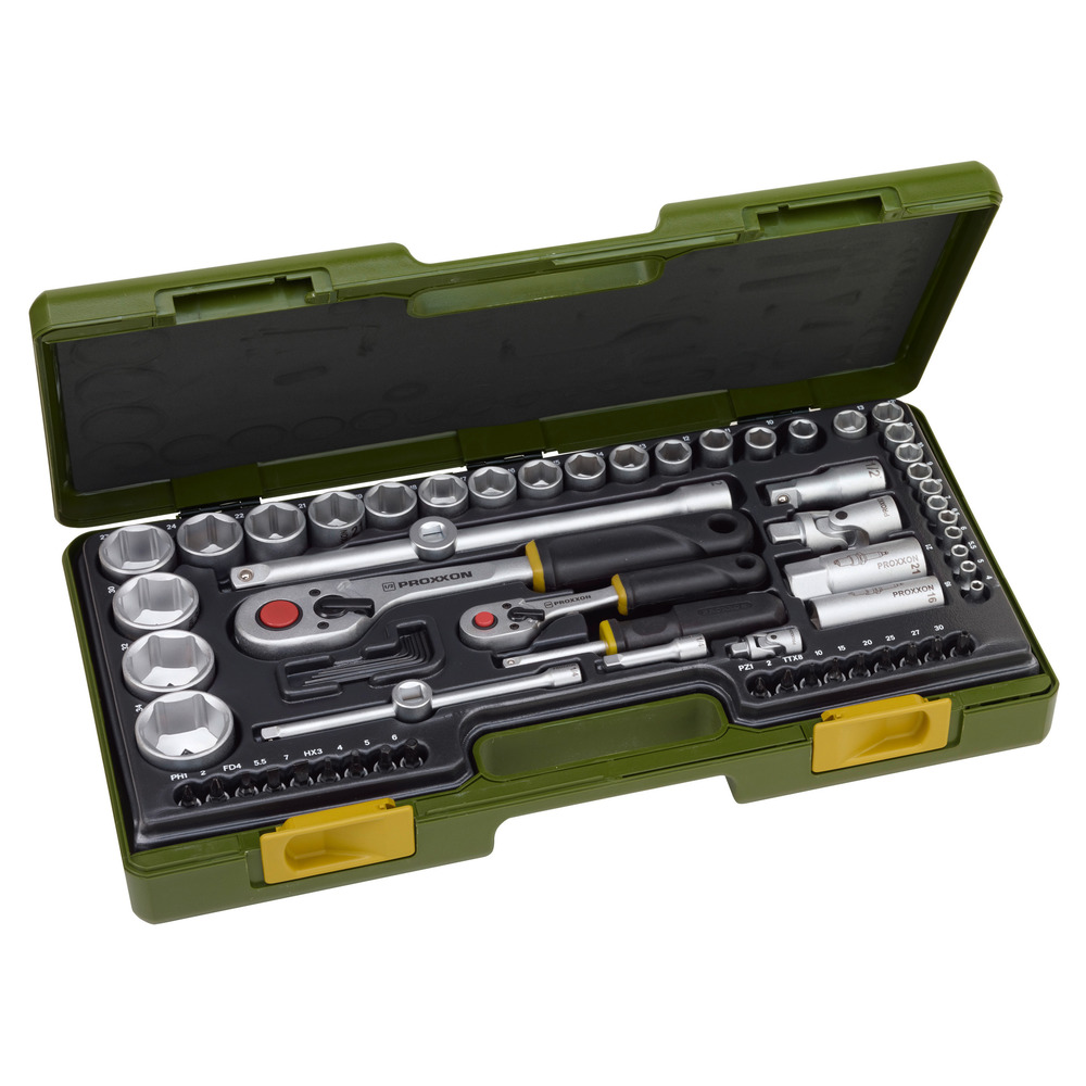 65-tlg. Stecknusskassette mit vollständigen 1/2″(10-34 mm) und 1/4″(4-13 mm) Nuss-Sätzen. Zusätzlich mit allen gängigen Kreuz, Schlitz sowie Torx-Schraubendrehereinsätzen, Zündkerzenschlüssel usw. Komplettes Qualitätswerkzeug auf kleinstem Raum.