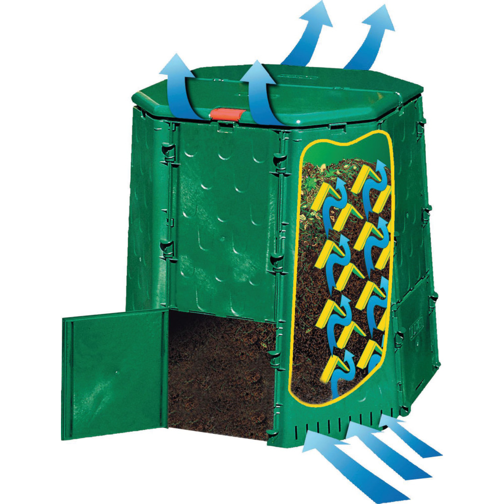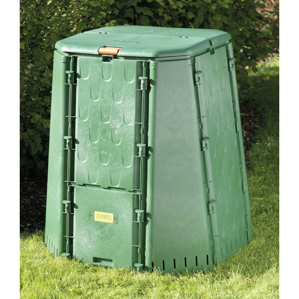 Aktiv-Belüftungssystem mit Wandlamellen – nur von JUWEL.– stabil, korrosionsbeständig; Verbindung der Wandelemente mit JUWEL-Klemmhülsen; ausgezeichnetes Design – konische Form; sehr große Befüll- und Entnahmeklappen; Scharnierdeckel mit Schiebegriff zur Windsicherung; hochwertiger, UV-stabiler Recyclingkunststoff, Ca. 700 Liter Nutzinhalt , Abmessungen: 94 x 94 x 109 cm