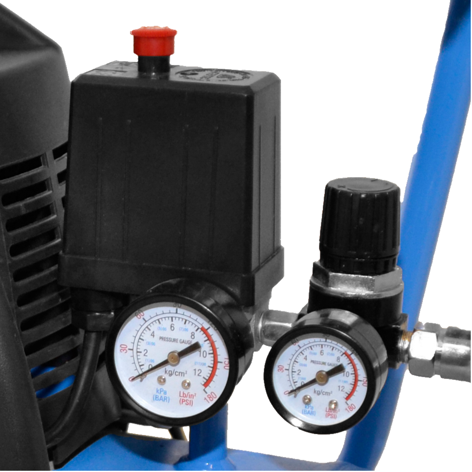 Preiswerter und kompakter Kompressor für den privaten Anwender.Kein Wartungsaufwand und saubere Druckluft durch ölfrei Bauform.24 L Kessel mit Räder und integriertem Fahrbügel. Komplett mit Druckschalter, Manometer und Druckminderer.Technische Daten:Ansaugleistung 140 l/minHöchstdruck 8 BarMotor 1,1 KW/ 1,5 PS 230 VoltKesselinhalt 24 LEigengewicht nur 22 Kg
