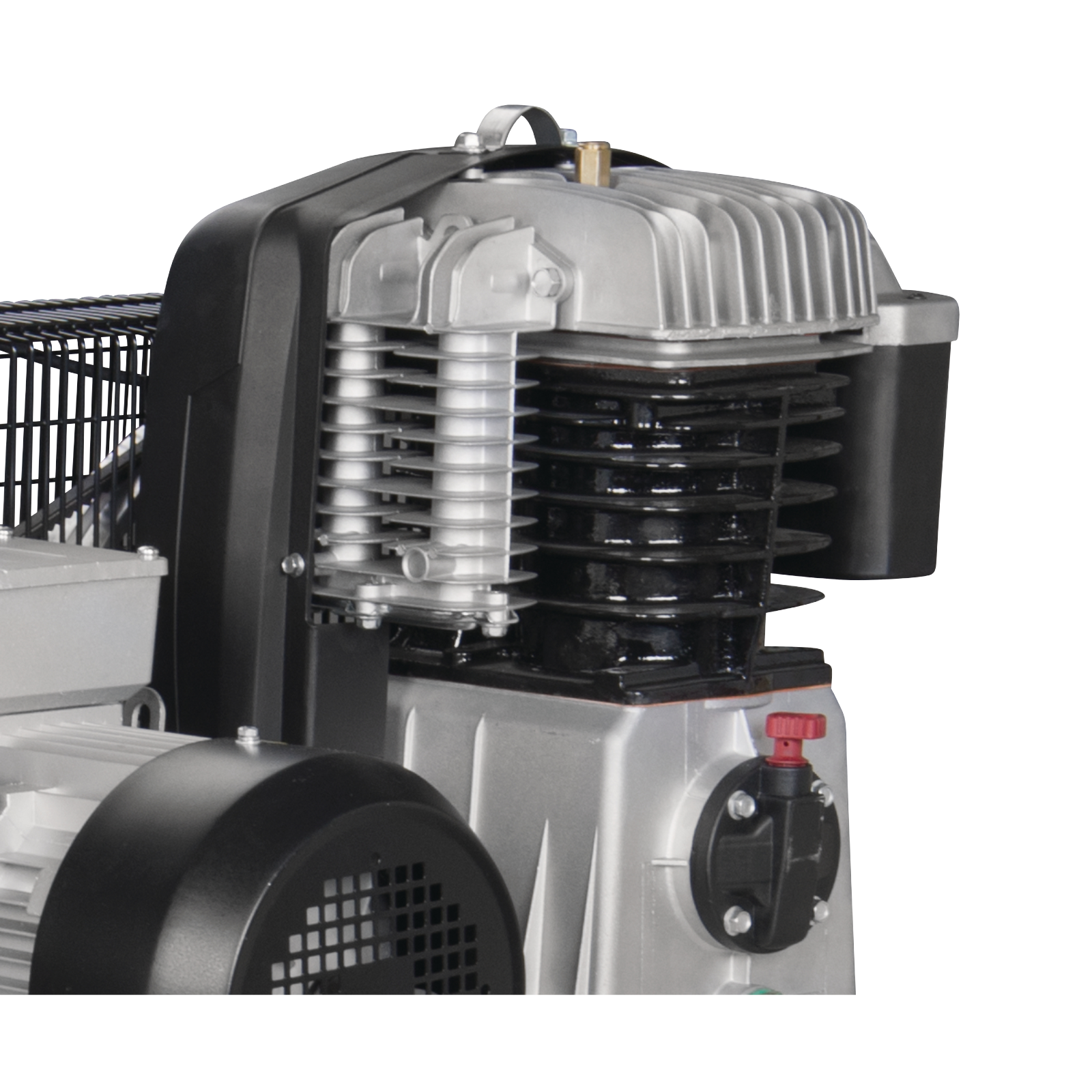 Großes Lüfterrad und ein Kühlluftleitblech am Zylinder für optimale Kühlung des Verdichters