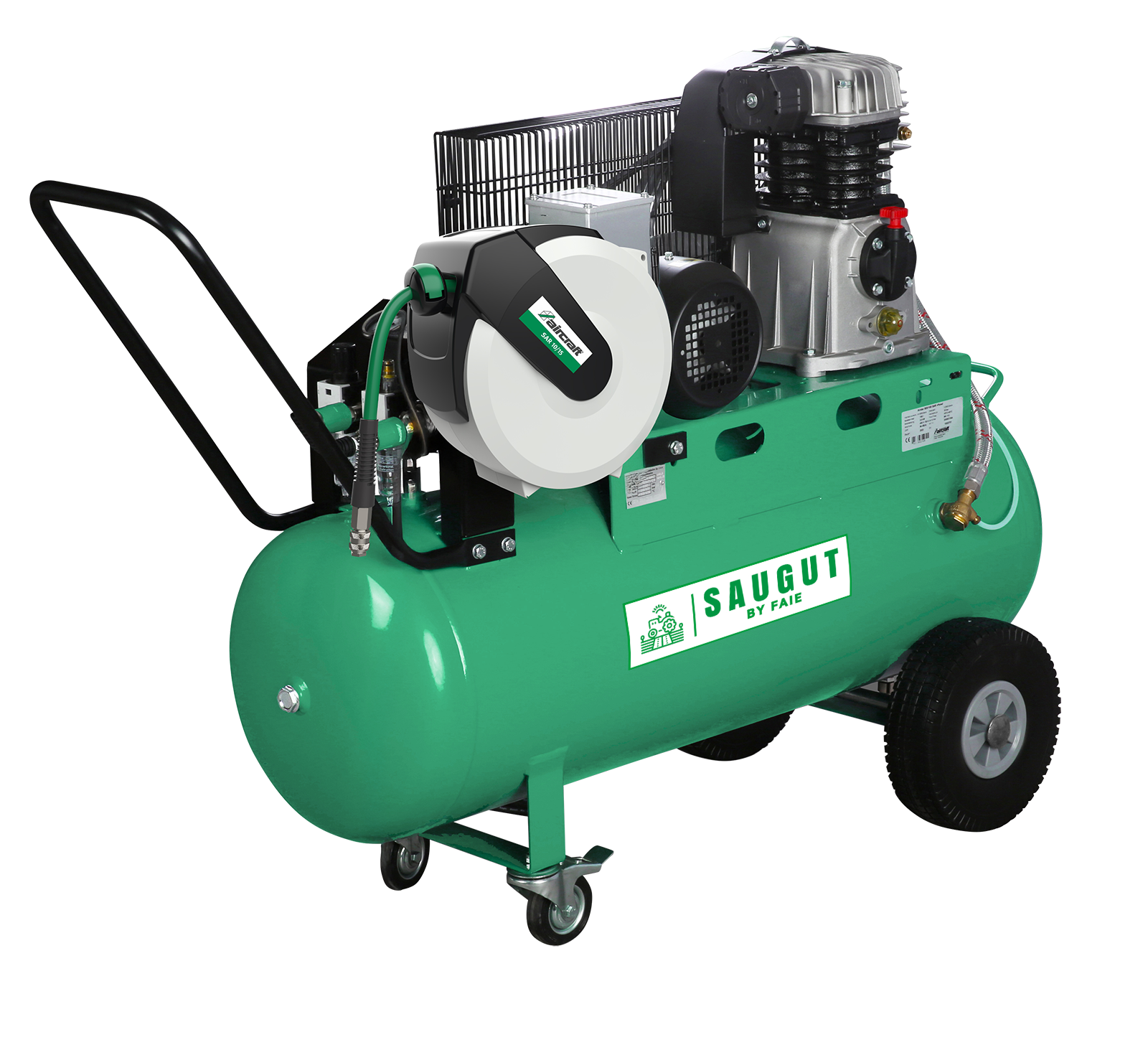 Der Qualitäts-Elektromotor hat eine Leistung von 3,0 kW/4,0 PS/400V bei 2800 Umdrehungen pro Minute. Der 100 Liter große Kessel sorgt für genügend Druckspeicher und verhindert ein ständiges Aus- und Einschalten der Anlage.