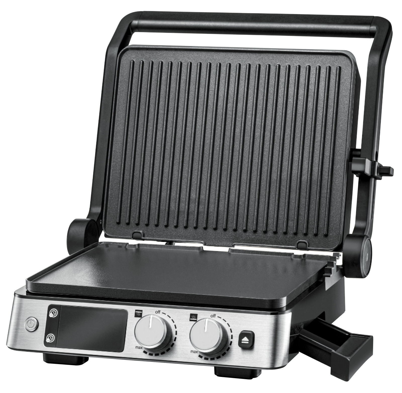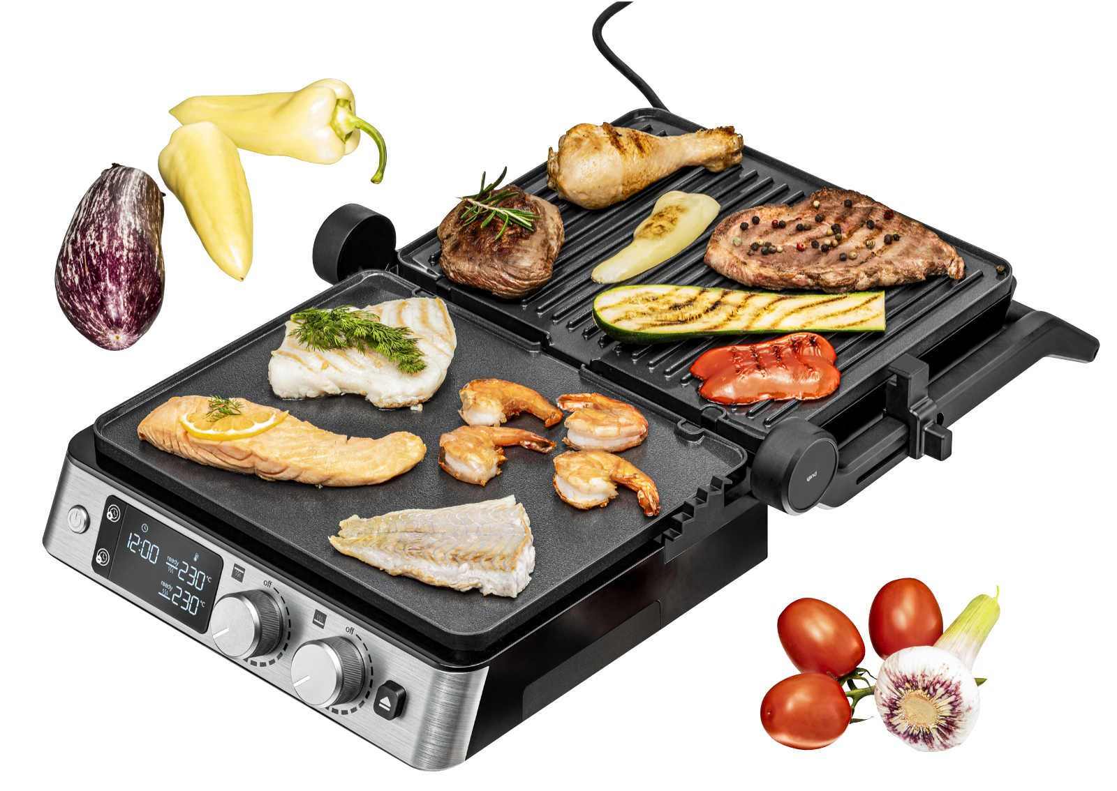 Besondere Merkmale: Gehäuse mit Anti-Fingerabdruck-Beschichtung, 5-fach höhenverstellbar , 2 getrennt regelbaren Grillflächen