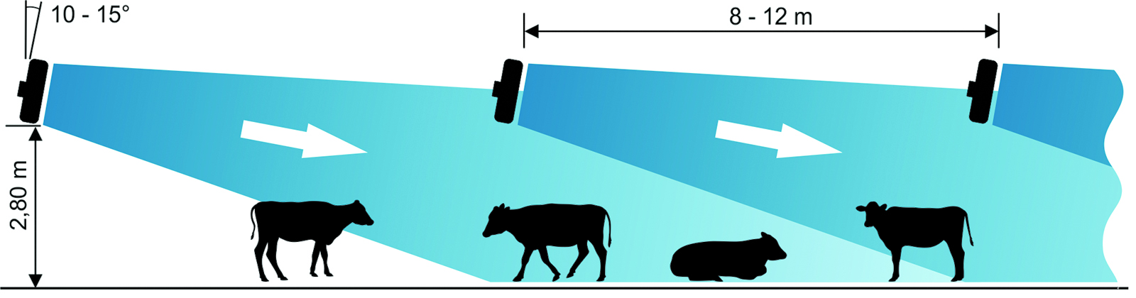 offene und geschlossene Ställe. In offenen Ställen sollte die Luftströmung an die Hauptwindrichtung ausgerichtet oder kühlere Luft von der Nordseite angesaugt werden. In geschlossenen Ställen sollten die Ventilatoren an die Zuluft-Ventilation angeschlossen werden.