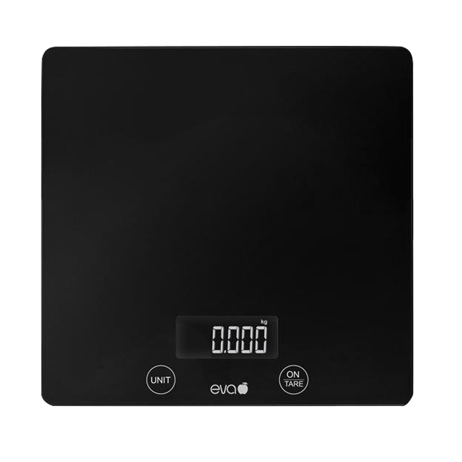 Edle Küchenwaage mit bis zu 15kg Wiegebereich aus schwarzem Glas.Maße: 21,8x21,8x3,4cm.Batterien enthalten, es sind 2xAAA