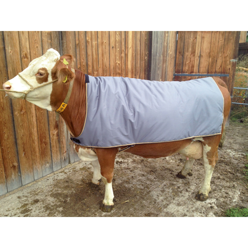 Wärmende, gut sitzende Decke für kranke und festliegende Kühe. Verwendbar auch zum Schutz bei Ausstellungen. Obermaterial aus reißfestem 600 Denier Polyester-Ribstopp mit weichen, flexibel verstellbaren Beingurten vorne und hinten.Wasserdicht bis 3000 mm Wassersäule, atmungsaktive Eigenschaften verhindern übermäßiges Schwitzen (3000 g/m²/24 h).Maschinenwaschbar bei 30 °CIn den Rückenlängen 145 cm (für Braunvieh und normale Schwarzbunte) oder 155 cm (für Fleckvieh und große Schwarzbunte) erhältlich.Größen: 145 cm (180 cm Gesamtlänge, 150 cm Breite), 155 cm (190 cm Gesamtlänge, 150 cm Breite)