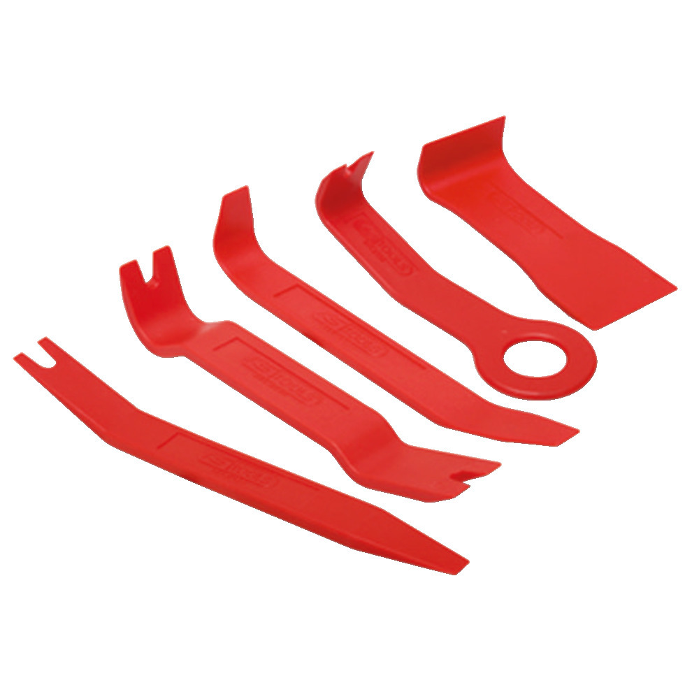 Ideal zum Lösen von diversen Verkleidungsteilen. Praktische Zusammenstellung verschiedener Keil- und Hebelvarianten. Schlanke und robuste Ausführung. Ideal zum lackschonenden und beschädigungsfreien Lösen von Verkleidungsteilen, Zierleisten, usw. Für filigranes Arbeiten an leicht zerbrechlichen Verkleidungsteilen. Aus Spezial-Kunststoff.
