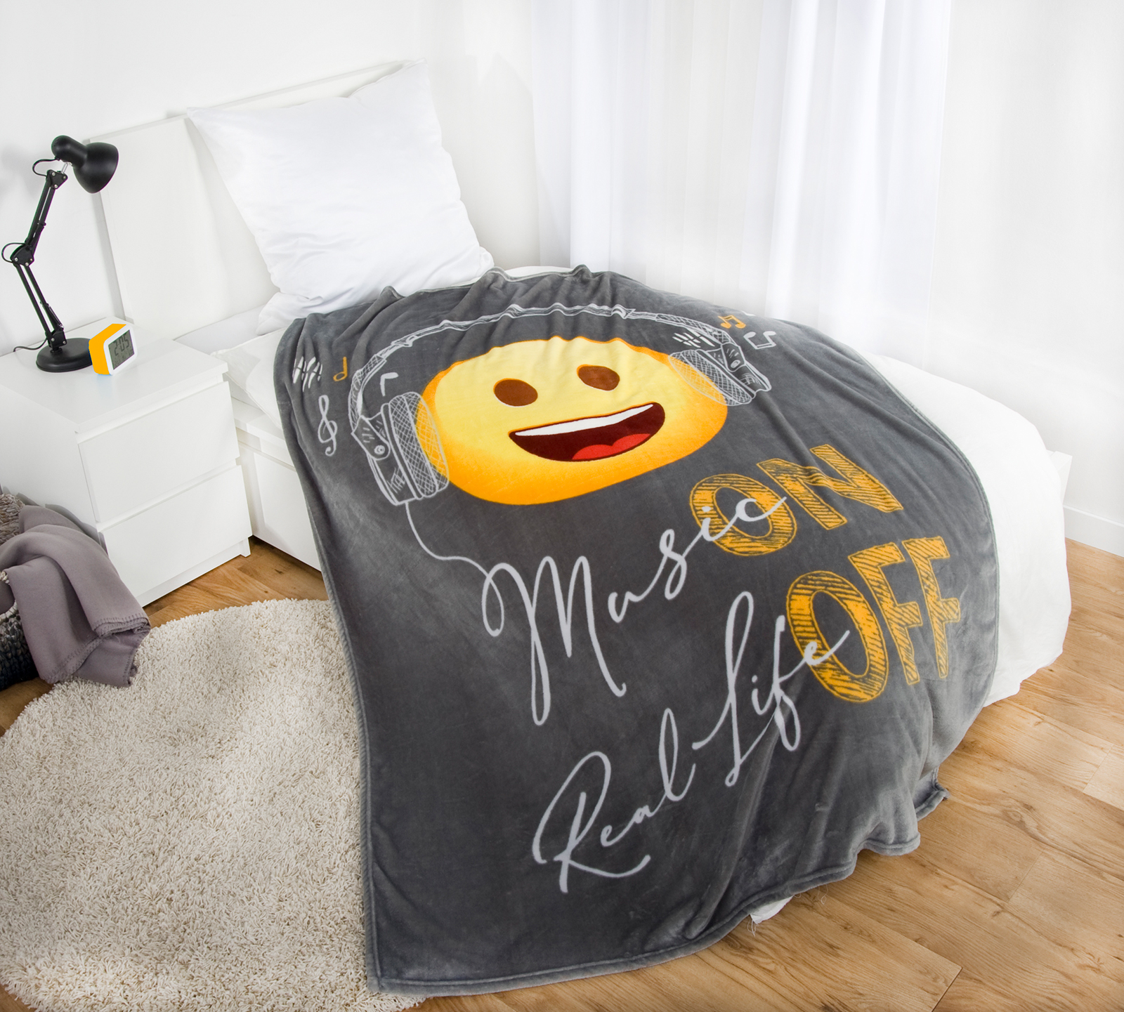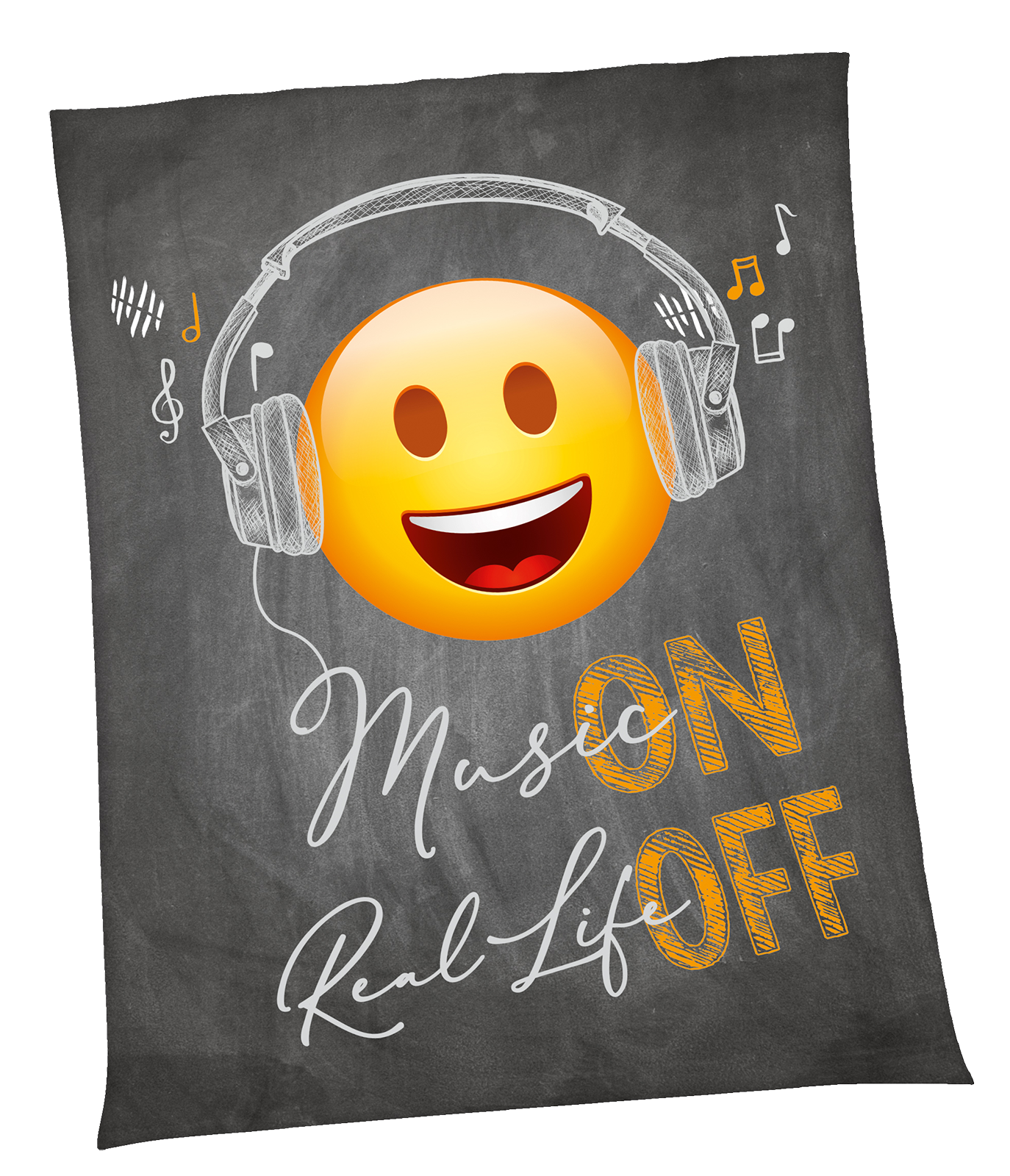 Mit dieser Decke holst du dir gute Laune und Musik-Feeling direkt ins Wohnzimmer. Das coole Emoticon-Design mit Kopfhörern macht sie zu einem echten Blickfang. Das superweiche Wellsoft-Material fühlt sich flauschig an, wärmt angenehm und bleibt dabei atmungsaktiv. Durch die großzügige Größe von 150 x 200 cm kannst du dich komplett einkuscheln.