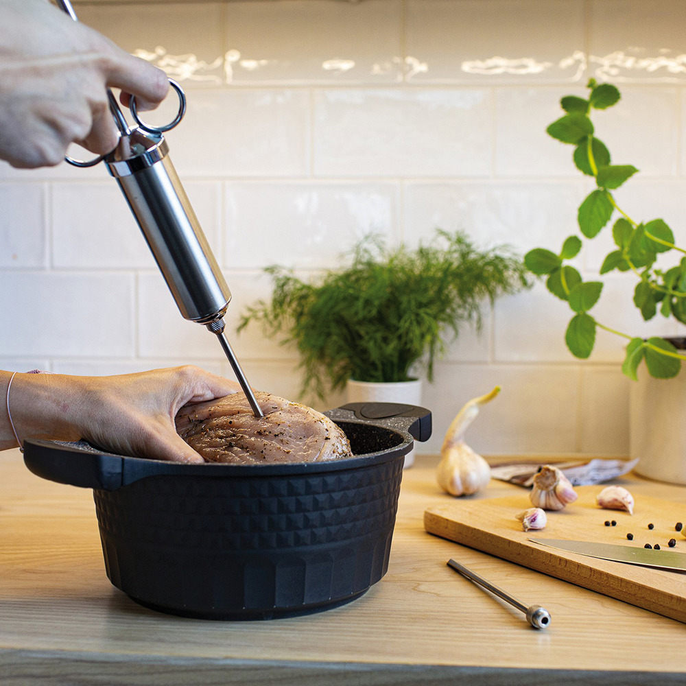 Handliche Edelstahl-Pökelspritze zum Einspritzen in Schinken oder Braten inkl. 2 verschiedener wechselbarer Spritznadeln.1 Spritznadel mit nur einer Öffnung zum Einspritzen in besonders großen Stücken. 1 Spritznadel mit vielen Öffnungen zum gleichmäßigen Einspritzen über das gesamte Fleischstück.