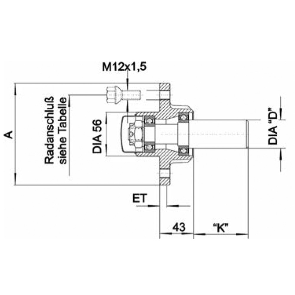 Laufstummel, Achsstummel für 4-Loch Felgen, mit Radschrauben für ungebremste Anhänger.