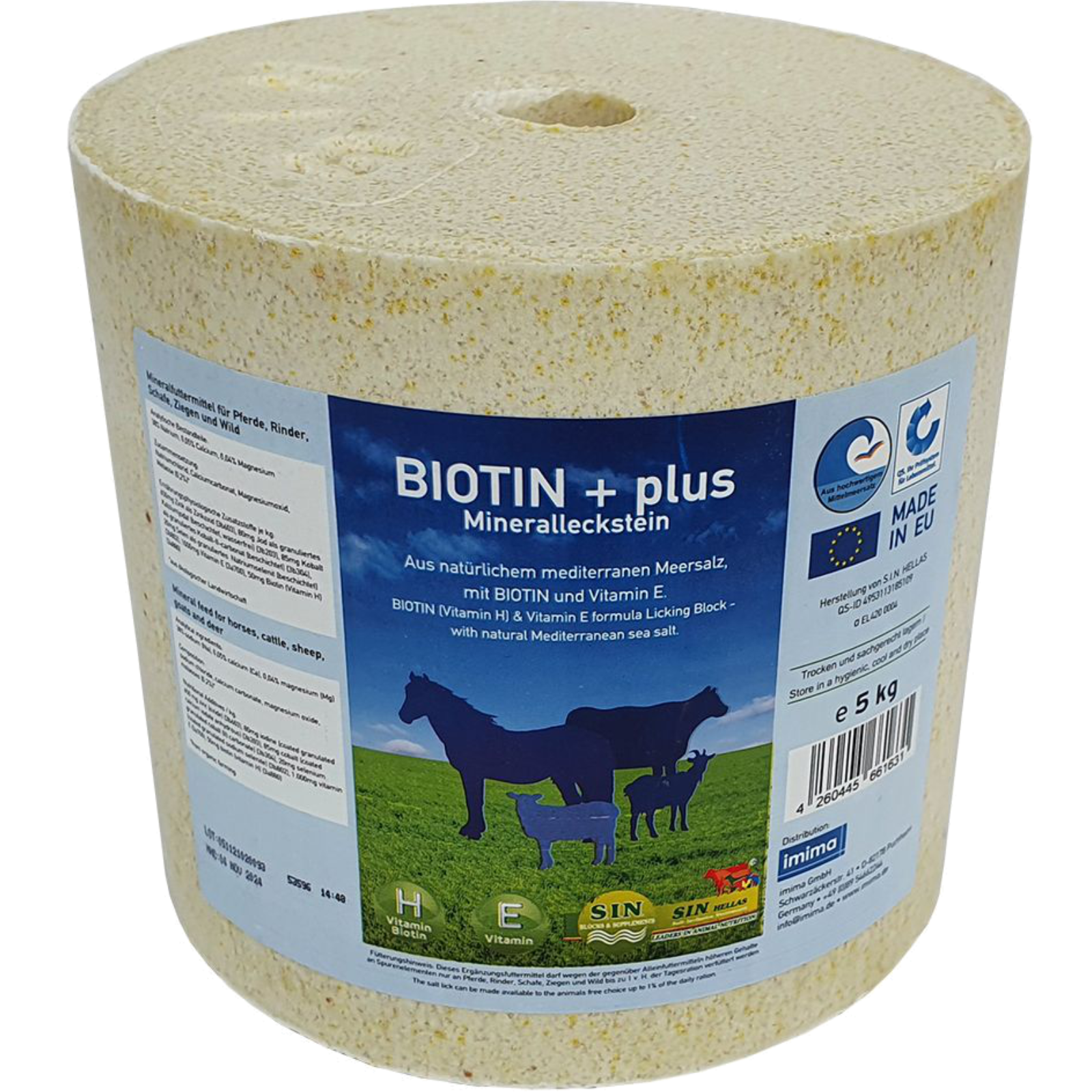 Salzleckstein mit Biotin und Vitamin E. Mineralfuttermittel für Pferde, Rinder, Schafe, Ziegen, Lamas, Alpakas und Wild.