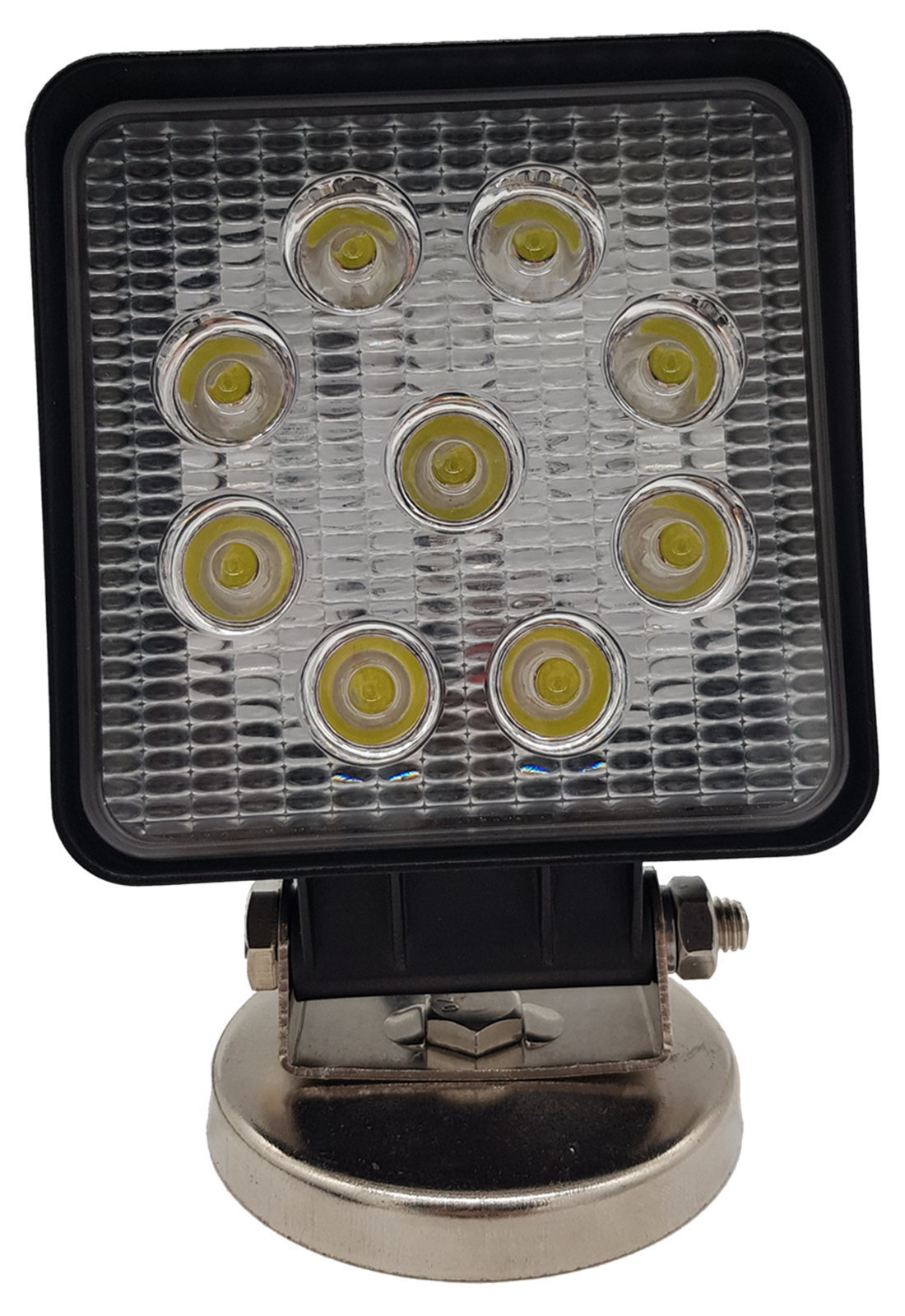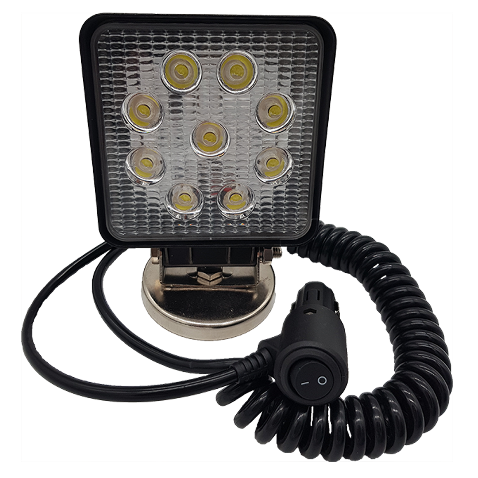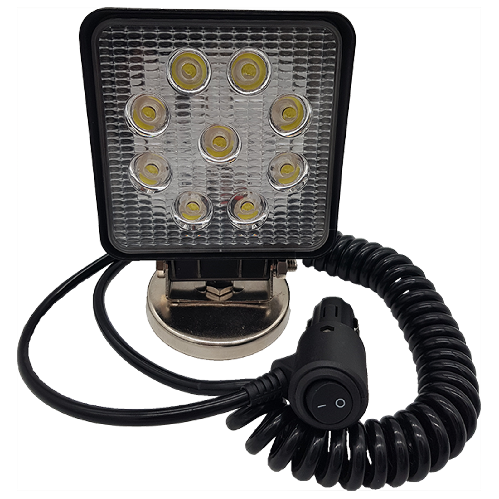 LED Arbeitsscheinwerfer eckig, 9x3 W, ca. 2160 Lumen, mit Magnetfuß, Gehäuse Aluminium, Glas Polycarbonat, Technische Details: Leuchtmittel: 9 x Hochleistungs-LED Epistar, Leistung: 27 Watt (9 x 3Watt)Spannung: 10-30 V, Lichtintensität: ca. 2160 Lumen, mit Magnetfuß, 3 m Spiralkabel, 12 V Zigarettenanzünderstecker mit Ein/Aus Schalter, Abmessungen (BxHxT): ca. 117 x 150 x 75 mm, Lebensdauer: ca. 30.000 Stunden, Nahbereichsstreulinse 60° (kurz und breit), Lichtfarbe 6000K, ECE R10