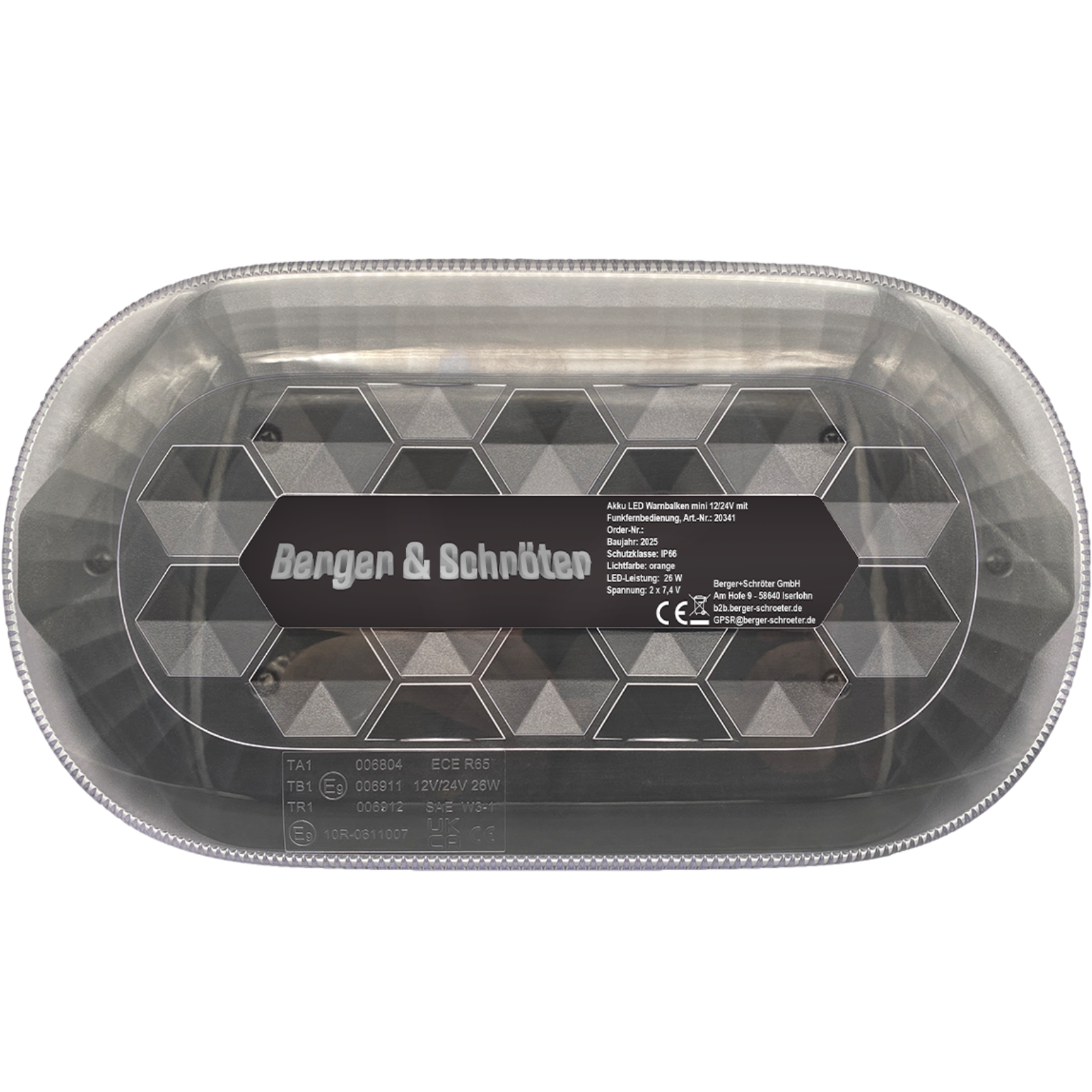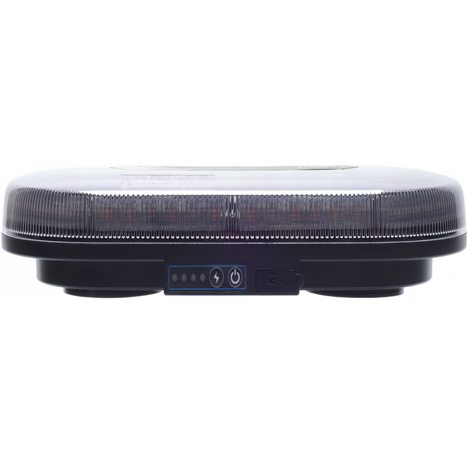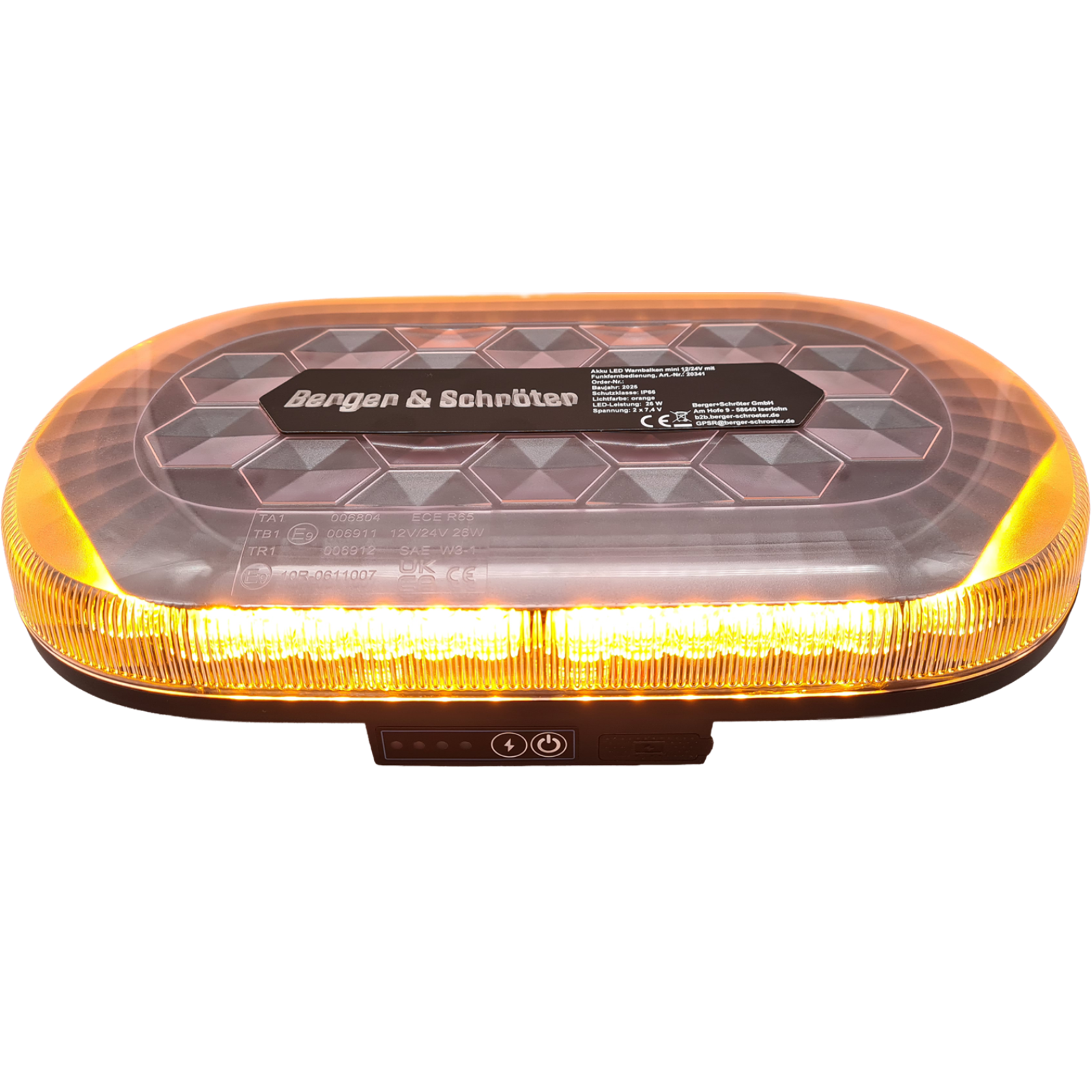 20341 Akku LED Warnbalken Mini,Magnetfuß, 12/24V, mit Funkfernbedienung, Betrieb über eingebauten Akku (4000 mAh, 2x7,4 V, 29,6 Wh),Homologation ECE R65, ECE R10, 48 superhelle LED´s (26 W),2 Stk. gummierte Magnetfüße, IP66, Temperaturfenster: -30°C - bis + 50°C,Hauben-Maße HxD ca. 30 x 326 mm,Gesamt-Maße ca. 326 x 182 x 63 mm, E-zeichen: E9 10R-0611007 / TA1 E9 00.6804,Ladung über USB mit 5V, 2A, Ladezustandsanzeige,Betrieb bis ca. 8 h. Steuerung über Funkfernbedienung bis zu 50m möglich.Mehrere Blitzfolgen schaltbar: