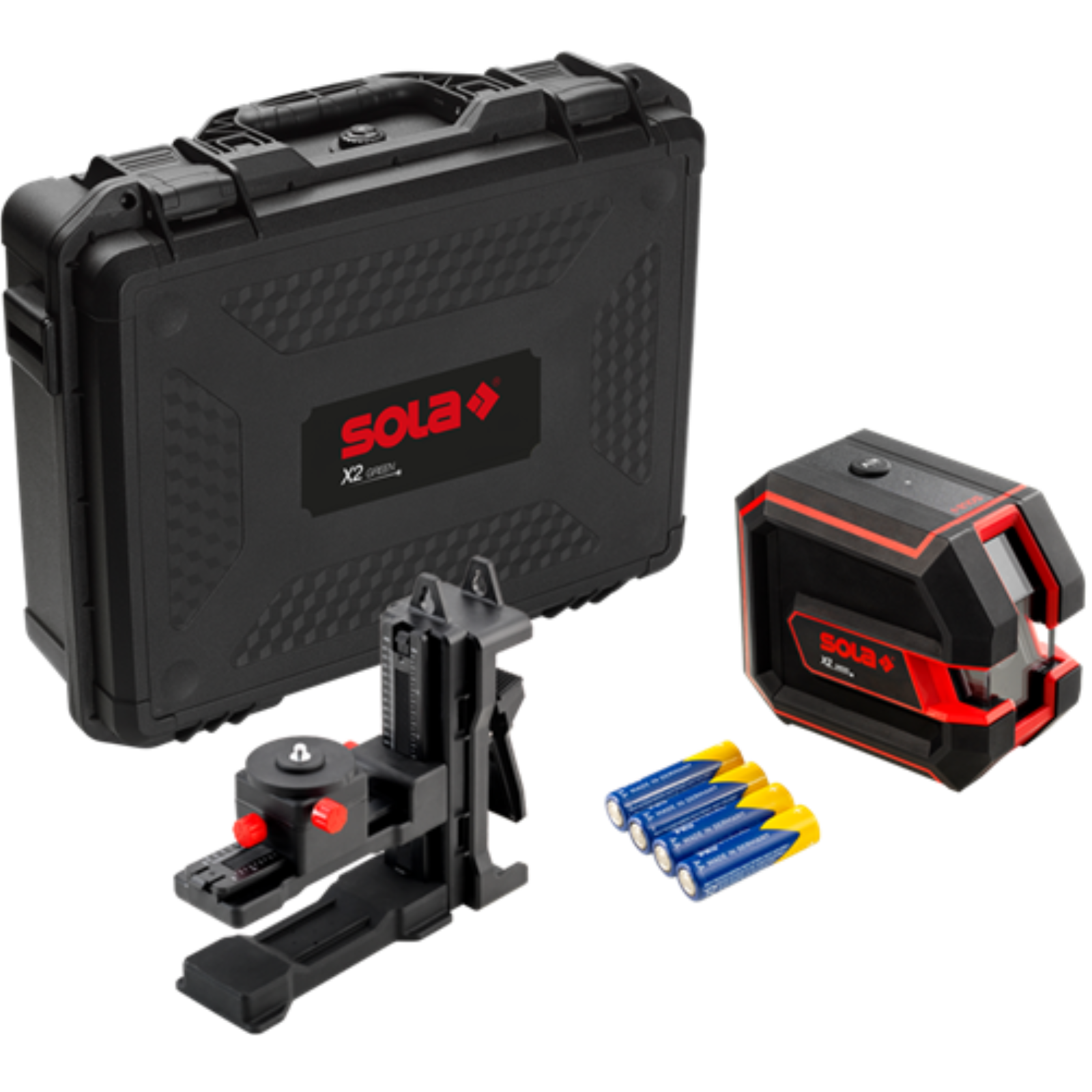 Set-Inhalt: Koffer, Universal-Wandhalterung und Batterien