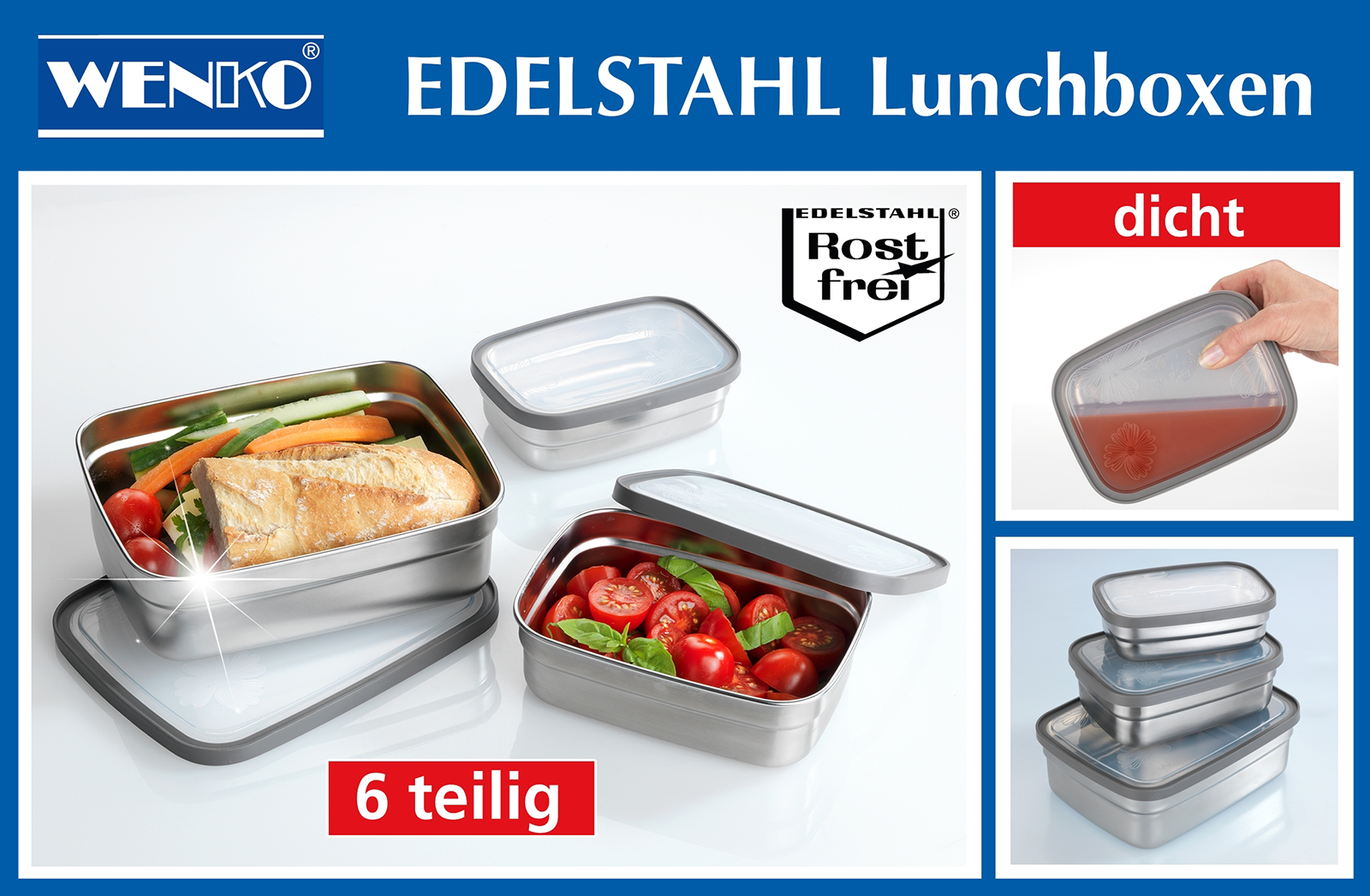 Material: Boxen aus rostfreiem Edelstahl, Deckel aus Kunststoff (PP).
