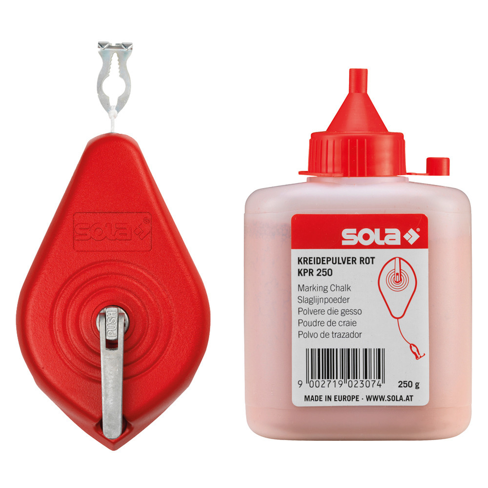 Hochwertiges Schlagschnurgerät aus Magnesium-Druckguss. Freilauf-Funktion für Schnurauszug, Schnurlänge: 30m, Reißkraft max. 234 N, Inox Gürtelclip. Aktionsset mit 250 g Kreide.