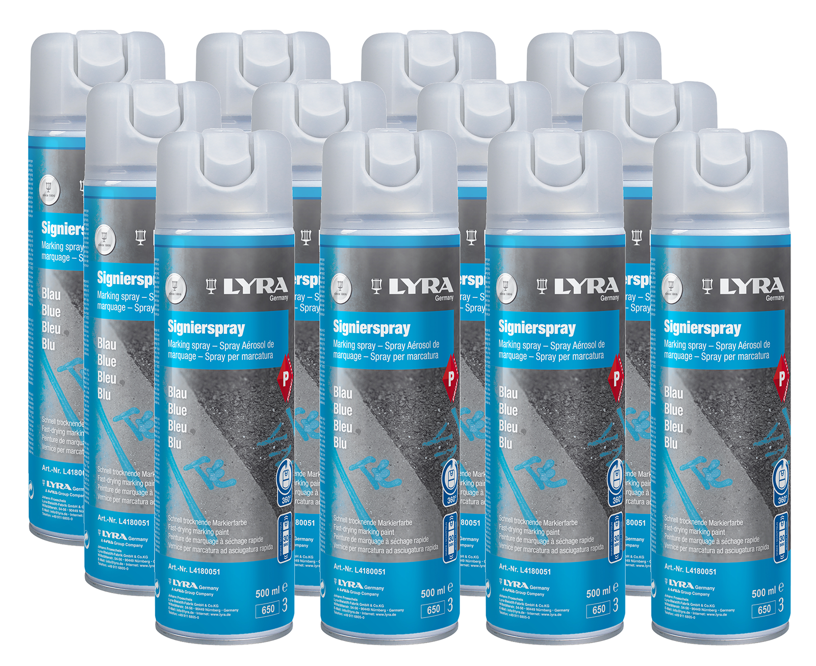 12er SET Spraydosen blauProfi Qualität.Mit Schreibsprühkopf 500 mlzum Anzeichnen und Beschriften von Holz, Steinen usw.schnelltrocknend, hohe Deckkraft.