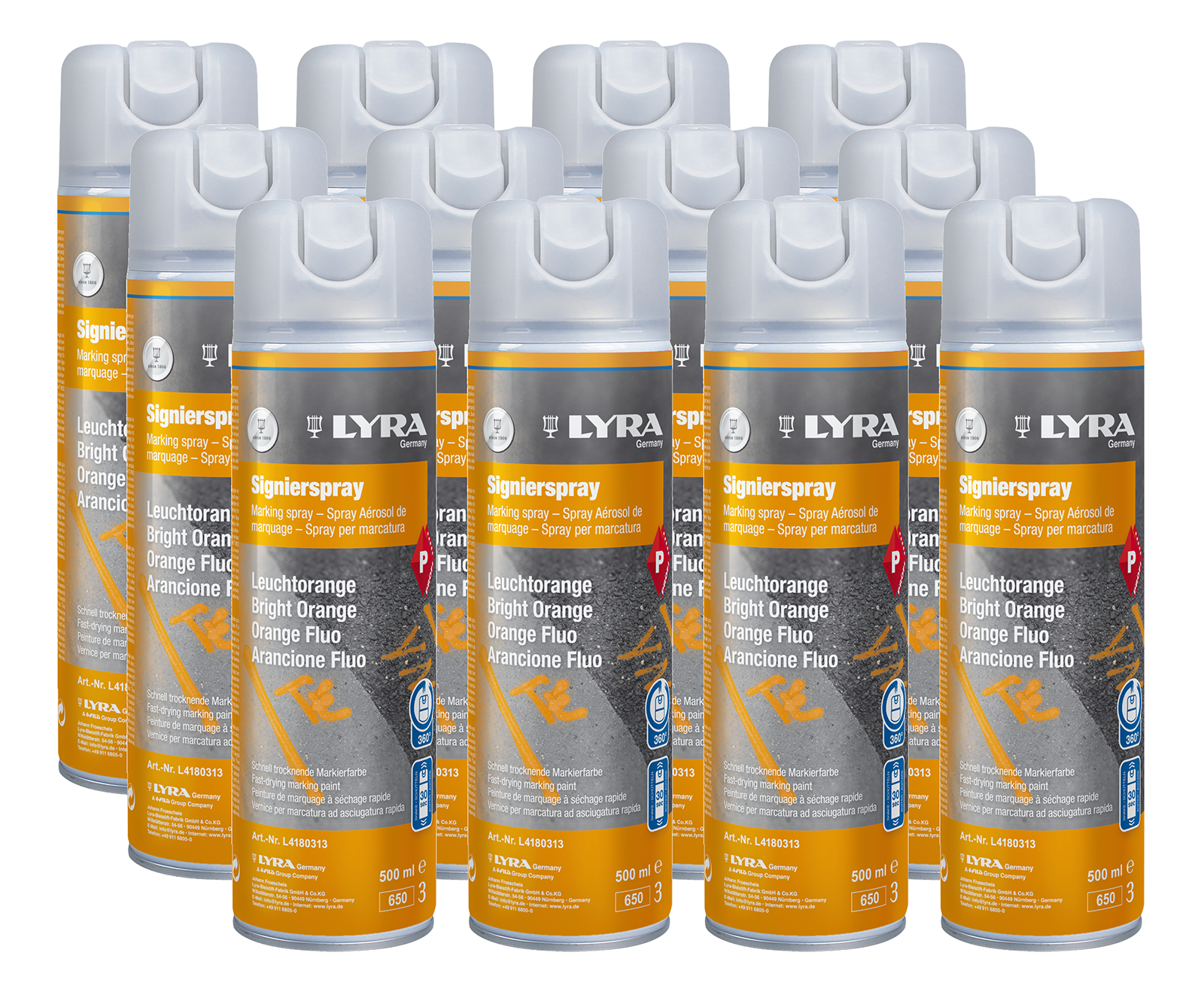 12er SET Spraydosen Signal-orangeProfi Qualität.Mit Schreibsprühkopf 500 mlzum Anzeichnen und Beschriften von Holz, Steinen usw.schnelltrocknend, hohe Deckkraft.