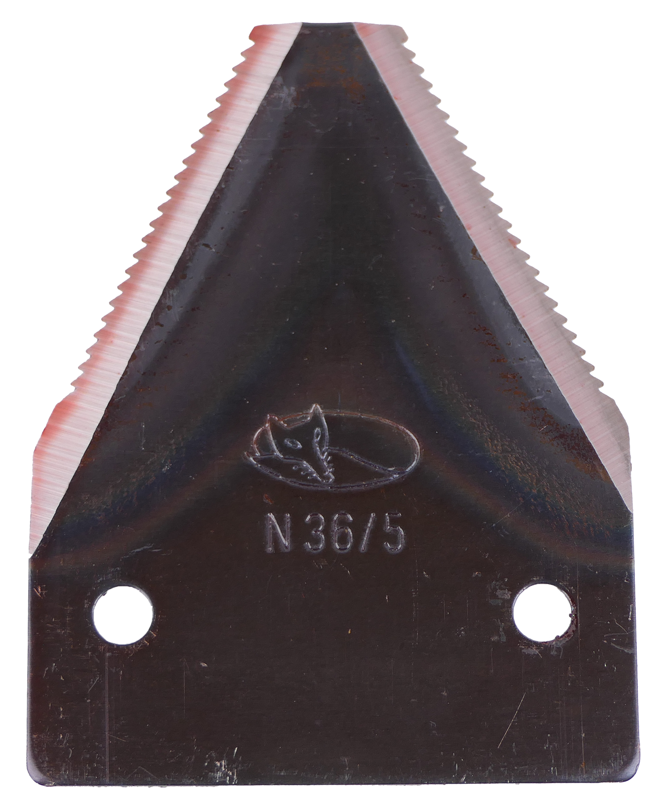 Klinge N36/5g gezahnt, 75 x 58 x 2 mm - schmale Mörtl Klinge. Dieser Klingentyp wurde bei den Mähwerken UNI-Rasant und UNI-Florett verbaut.
