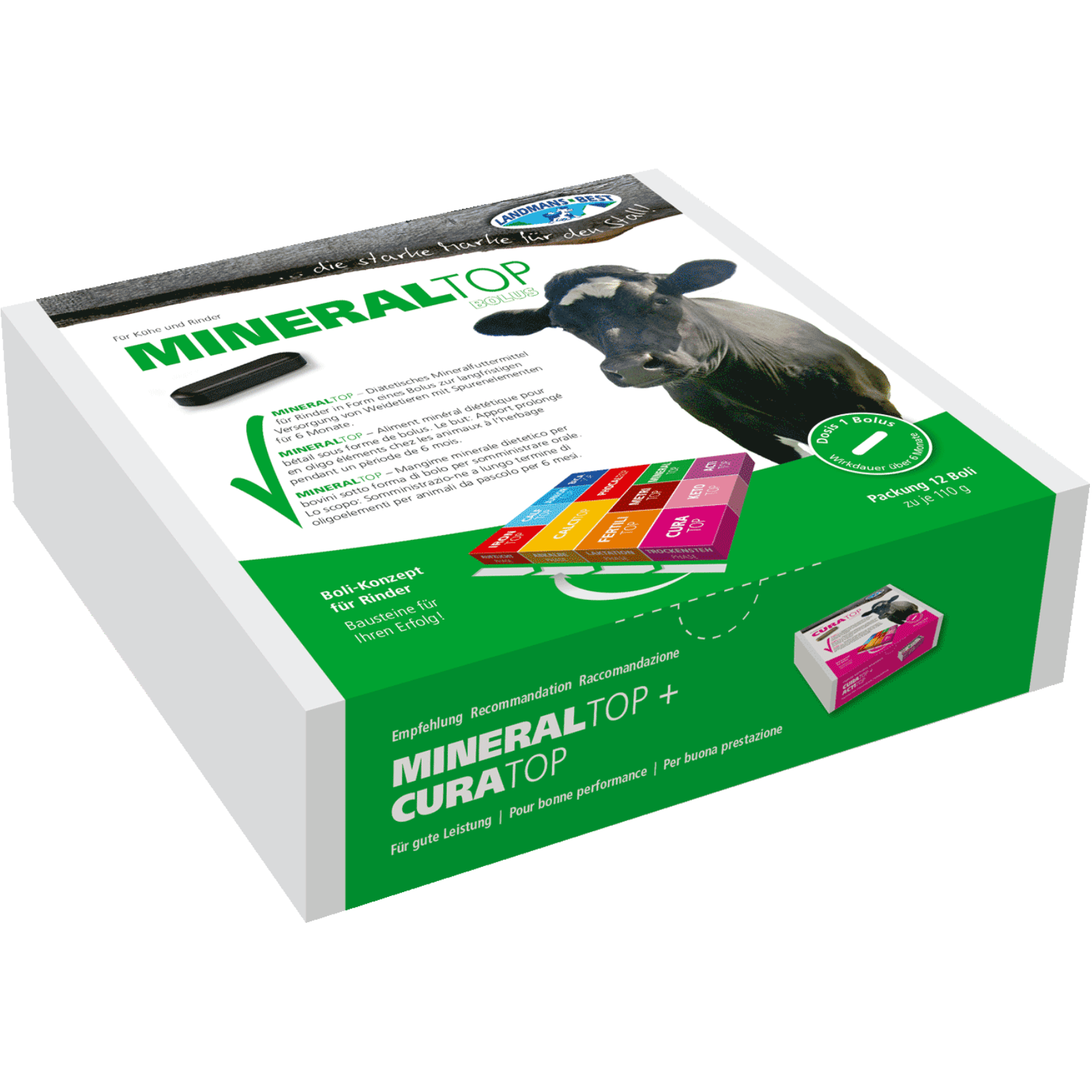 Mineraltop Bolus für Rinder und Kühe bietet eine zuverlässige und sichere Ergänzung mit Spurenelementen während der Produktion und Weidezeit. Der Bolus unterstützt die Gesundheit, Leistung und Fruchtbarkeit der Tiere und eignet sich bestens für die ganzjährige Versorgung. Ein Langzeit-Bolus versorgt Ihre Tiere bis zu sechs Monaten mit Spurenelementen. Für Rinder und Kühe ab einem Gewicht von 250 kg.