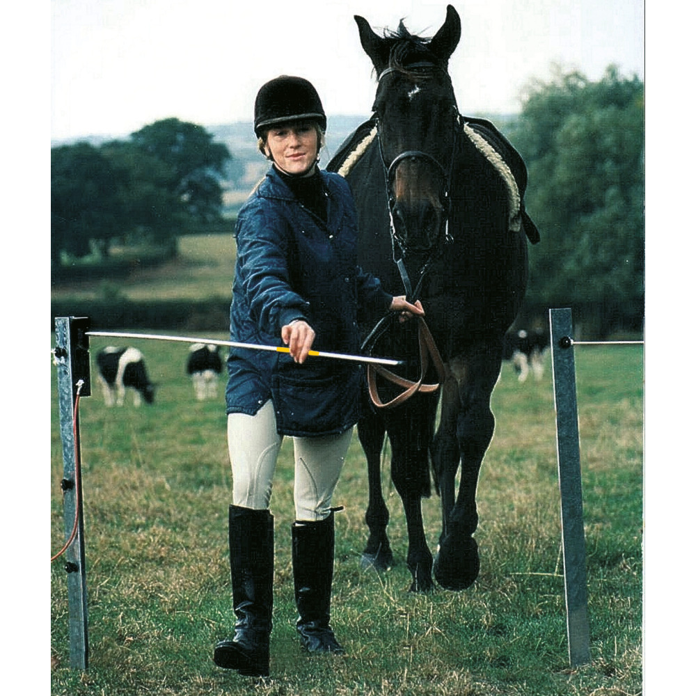 Ist mit jedem Weidezaungerät zu betreiben und kann leicht in bestehende Zaunanlagen eingesetzt werden. Die flexiblen Glasfiberstäbe sind mit elektrisch leitfähigem Gummi überzogen, die isolierten Handgriffe sind für Fußgänger. Das physikalische Gesetz des faradayschen Käfigs schützt den Fahrer vor elektrischen Schlägen. Die Viehschranke öffnet sich in beide Richtungen und schließt selbständig. Feststellbar im geöffneten Zustand!