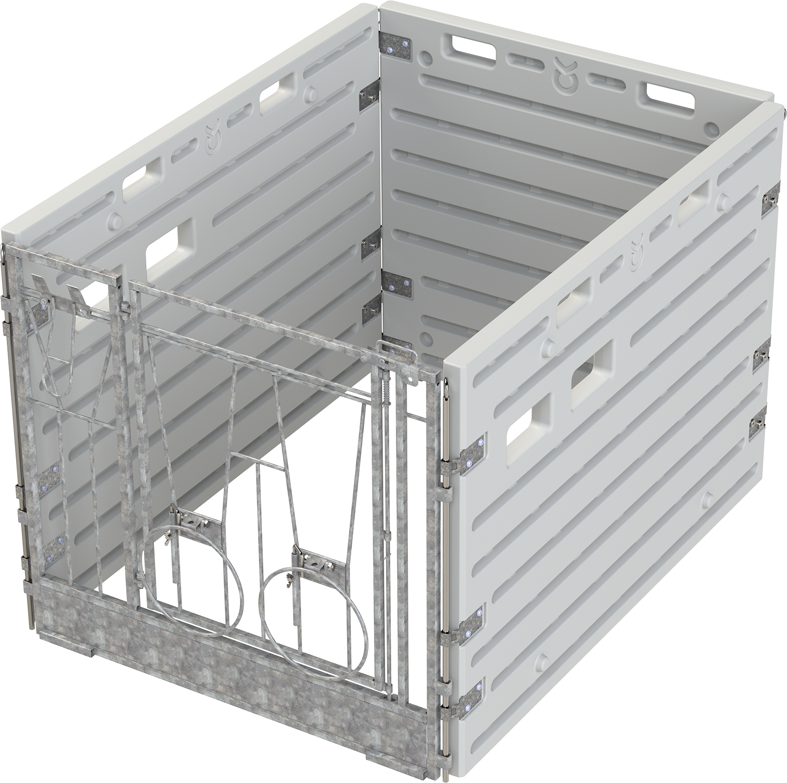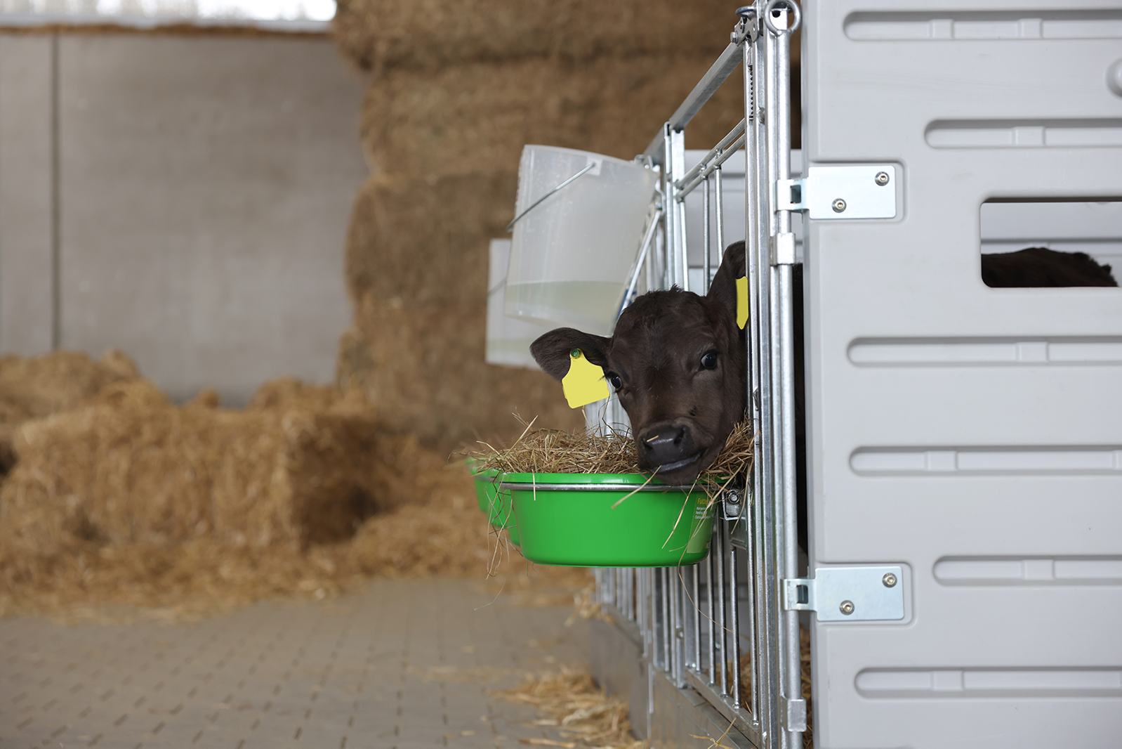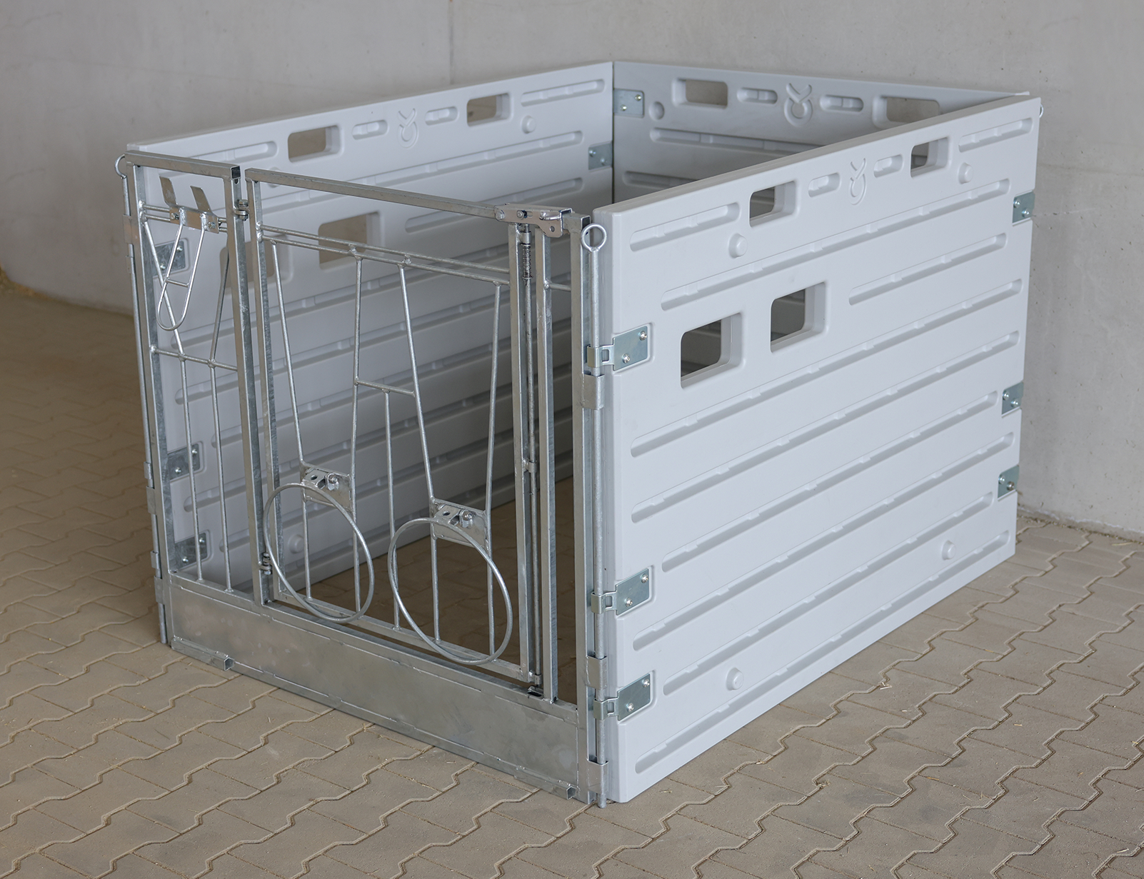 Modulare Kälberbucht (Einzelbucht, freistehend). Flexibles Stapelsystem aus robustem Kunststoff. Leicht zu reinigen, inklusive Frontelement mit durchschwenkbarer Tür und Eimerhalterungen. Platz: ca. 1,8 m².