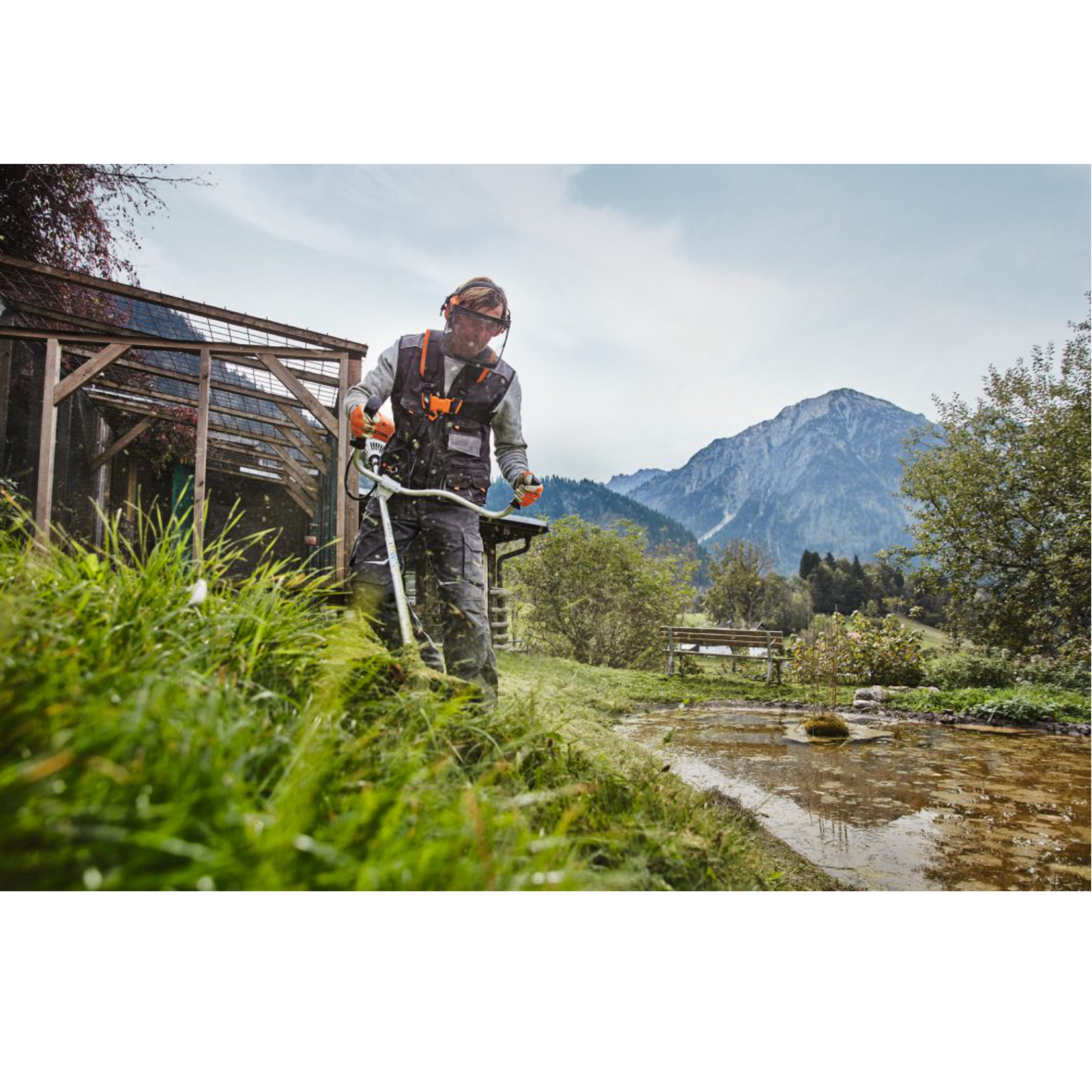 Die besonders leistungsstarke Motorsense STIHL FS 131 überzeugt Profis in der Landschaftspflege. Der kraftvolle STIHL 4-MIX®-Motor liefert ausreichend Leistung für Flächenarbeiten in zähem Gras. Das abgasreduzierte Aggregat überzeugt mit seiner hohen Durchzugskraft und überträgt das hohe Drehmoment durch eine starre Antriebswelle auf das Schneidwerkzeug. Um möglichst effektiv große Flächen bearbeiten können, ist die Benzin-Motorsense STIHL FS 131 mit einem ergonomischen Zweihandgriff (Mählenker) ausgestattet. Dieser unterstützt die natürliche Sensenbewegung. Der Einhand-Multifunktionsgriff lässt Sie alle wesentlichen Funktionen schnell und einfach erreichen. Sollten Sie einmal Ihre Arbeit unterbrechen und wieder aufnehmen wollen, unterstützt Sie der integrierte Stopptaster dabei, direkt und ohne die Betätigung von Schaltern die Sense wieder zu starten und mit der Arbeit fortzufahren. Damit Ihre Muskeln und Gelenke gerade bei längeren Einsätzen geschont werden, ist diese Motorsense mit dem STIHL Antivibrationssystem ausgestattet. Auch der serienmäßig mitgelieferte Doppelschultergurt hilft Ihnen, das Gewicht des Geräts besser auf Ihrem Körper zu verteilen. Damit Sie möglichst wenig Zeit in die Wartung investieren müssen, ist die benzinbetriebene Motorsense STIHL FS 131 mit einem Luftfilter mit hoher Standzeit ausgestattet. Dieser ermöglicht Ihnen lange Wechselintervalle und längere Einsatzzeiten ohne Unterbrechung. So mähen Sie auch größere Flächen mühelos und besonders effizient.
