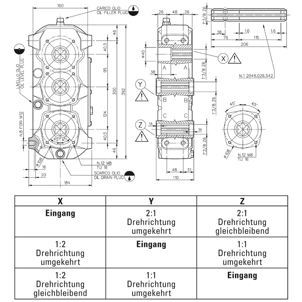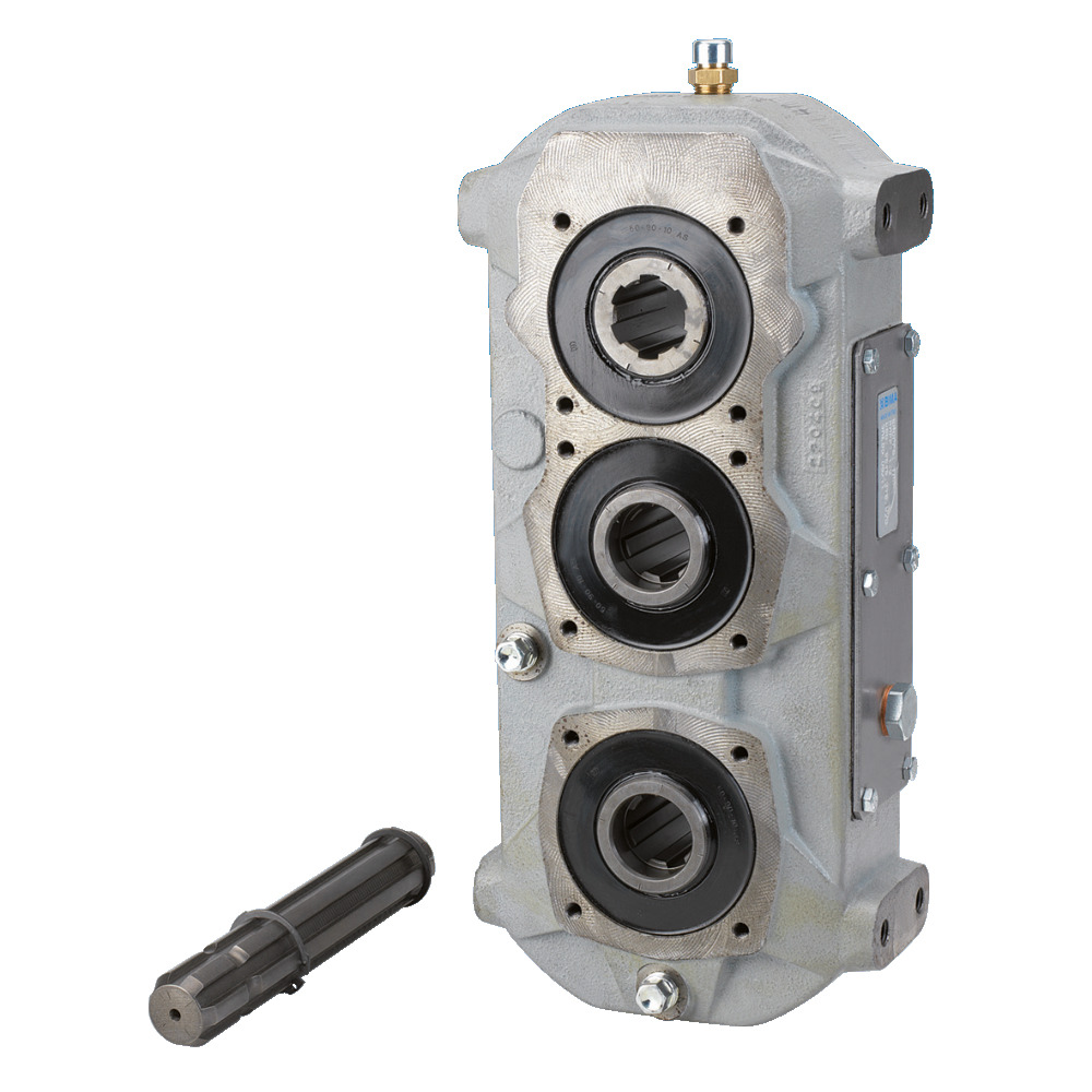 Durch verschiedene Kombinationsmöglichkeiten durch das Umstecken des mitgelieferten Zapfwellenstummels können Übersetzungsverhältnisse 1:1, 1:2 oder 2:1 unter Beibehaltung oder Änderung der Drehrichtung realisiert werden. Daraus ergeben sich 6 verschiedene Einsatzmöglichkeiten. Der Zapfwellenstummel wird durch Seegeringe in den Hohlwellen fixiert.44 kW bei 540 U/min bzw. 1000U/min.Zapfwellenanschlüsse: 3x 1 3/8 x 6Im allgemeinen führen Drehmomentspitzen bis zum 2-fachen des Nenndrehmoments zu keiner Beschädigung der einzelnen Getriebebauteile. Vollständige Unversehrtheit kann jedoch nur durch eine geeignete Sicherheitsvorrichtung gewährleistet werden.