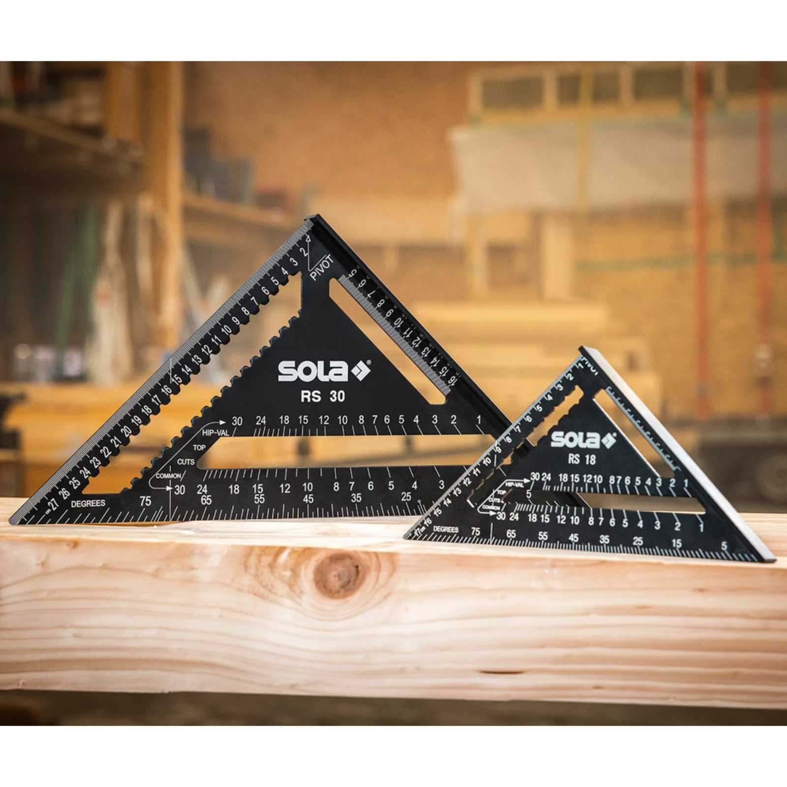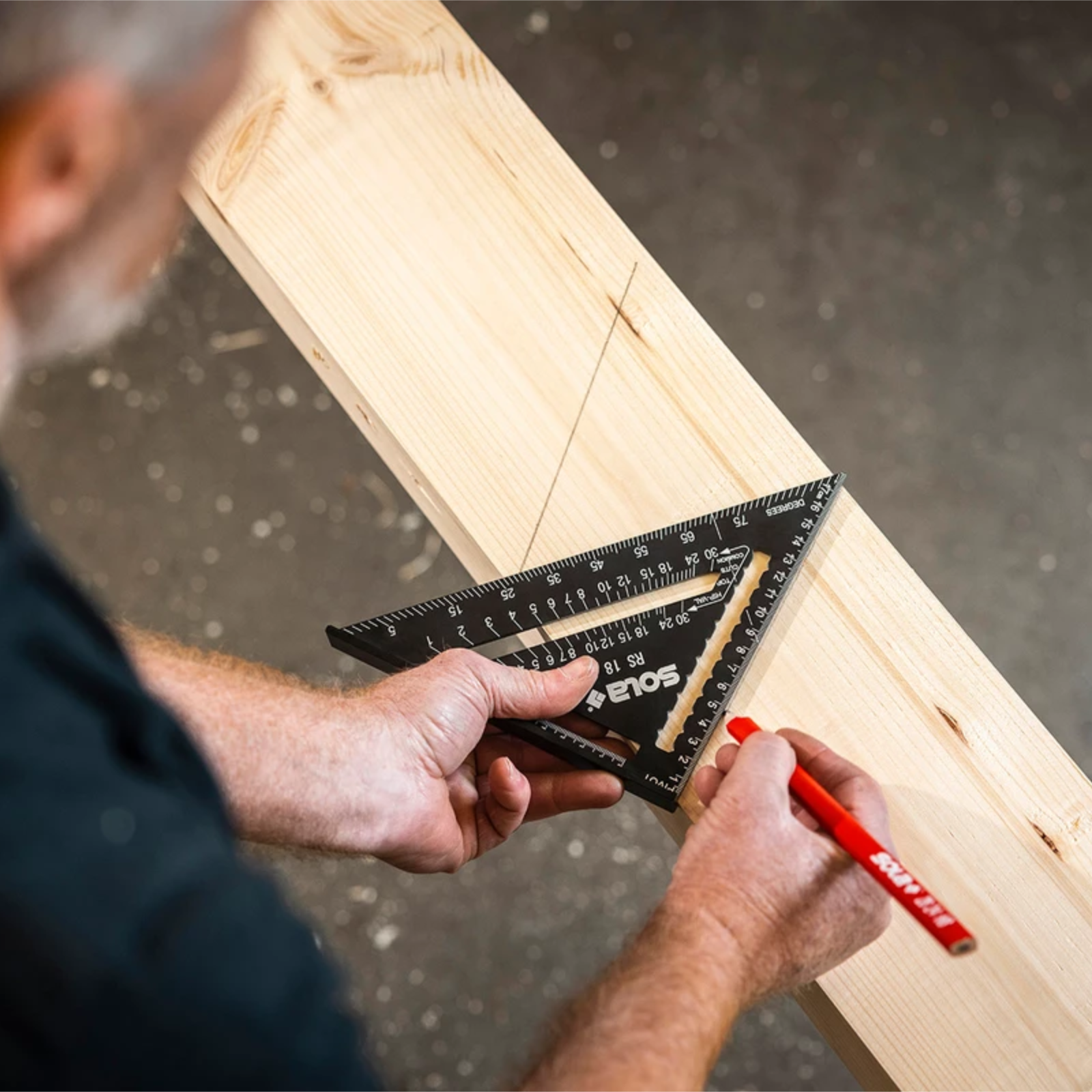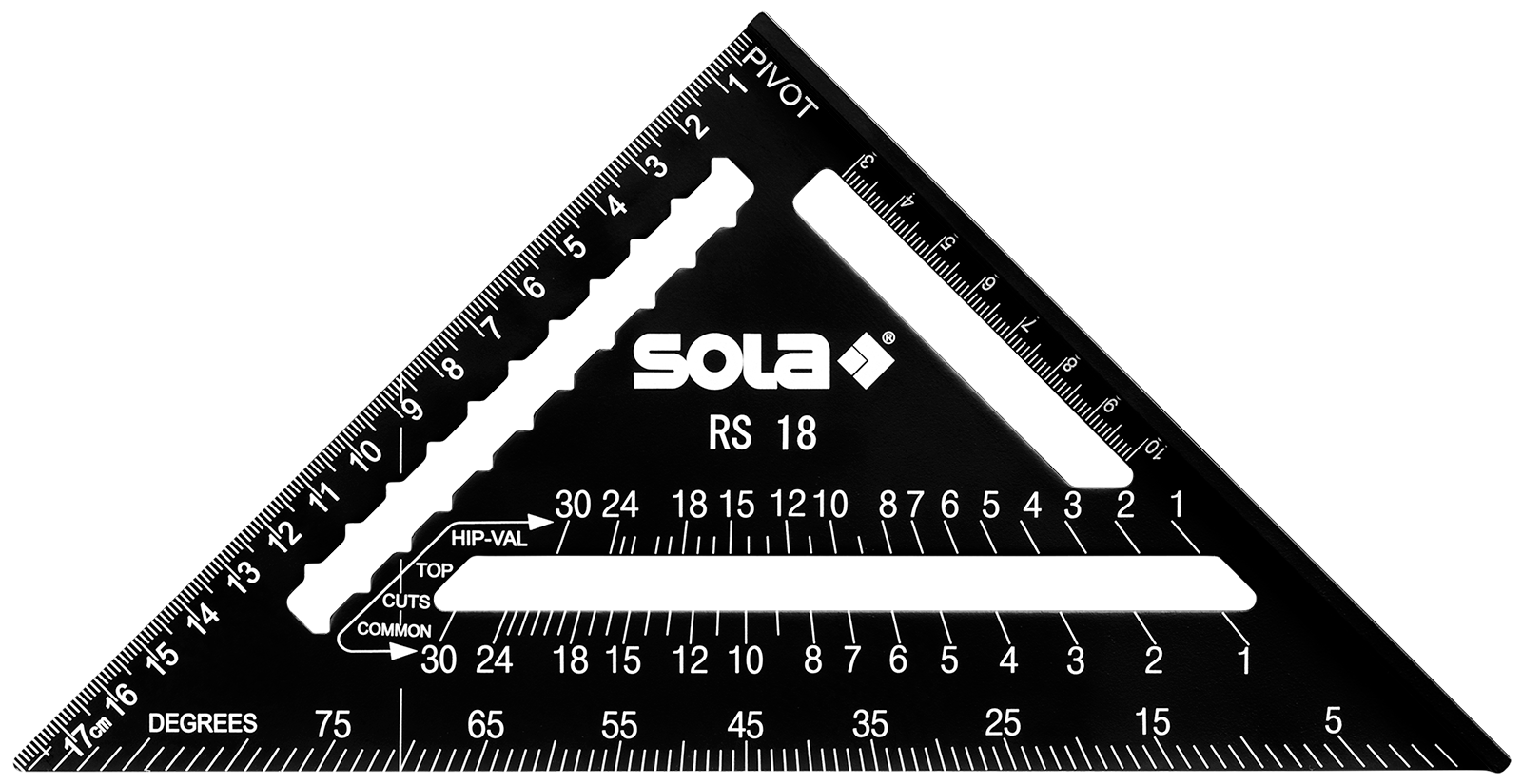 Das Anschlagwinkeldreieck wird auch Sparrenwinkel, Rafter Square oder Speed Square genannt und hat die Form eines gleichschenklig-rechtwinkligen Dreiecks mit einem Anschlag an einer Kathete.Die Vielzahl an Skalen und Aussparungen machen aus dem Anschlagwinkeldreieck ein multifunktionales Werkzeug, das sich ideal zum Markieren von Linien und Winkeln sowie als Anreißwerkzeug und Sägeführung eignet. Das Anschlagwinkeldreieck von SOLA vereint die Funktionen eines Lineals, Anschlagwinkels, Gehrungswinkels, Winkelmessers, Anreißhilfe, Sägeführung und Dachsparrenmessers.Der Sparrenwinkel in Form eines rechtwinkligen Dreiecks hat einen robusten Anschlag an einer Kathete für exakte 90°- und 45°-Markierungen. Zudem dient der Anschlag in Verbindung mit der robusten Kante auch als Sägehilfe bzw. Sägeführung. Parallel zum Anschlag befindet sich eine Aussparung mit metrischer Skala in mm und cm (Offset-Skala), die sich ideal zum Markieren senkrechter Linien eignet.Der Messschenkel der anderen Kathete hat ebenfalls eine metrische Skala, die schnelle Messungen erlaubt. Unterhalb dieser Skala ist eine Aussparung mit Kerben, mit welcher horizontale bzw. parallele Linien angerissen werden können. Die Hypotenuse besitzt eine Gradskala für Winkelmessungen zwischen 0° bis 90°. Der gewünschte Winkelgrad wird ausgehend vom gegenüberliegenden Drehpunkt bestimmt (Bezeichnung am Sparrenwinkel: PIVOT).Parallel zur Gradskala befindet sich eine weitere Aussparung mit zwei Skalen für Schifterschnitte. Die untere Skala ist für gewöhnliche Sparren bzw. Normalsparren (Bezeichnung am Sparrenwinkel: COMMON), die obere für Gratsparren und Kehlsparren (Bezeichnung am Sparrenwinkel: HIP-VAL). Im rechten Winkel zur Gradskala verläuft eine 90° Markierhilfe für Pfettenschnitte.Technische Daten:Artikelbezeichnung: SparrenwinkelMaterial: AluminiumOberfläche: beschichtetFarbe: schwarzSonderheit: AnschlagDachsparrengradmesserSkalierung: mm/cm,1-teilig, gelasertSkalen-Raster: 1 mmWinkelmaß: 45°, 90°, variabel 0° - 90°Anreisslöcher: 0.5 cm