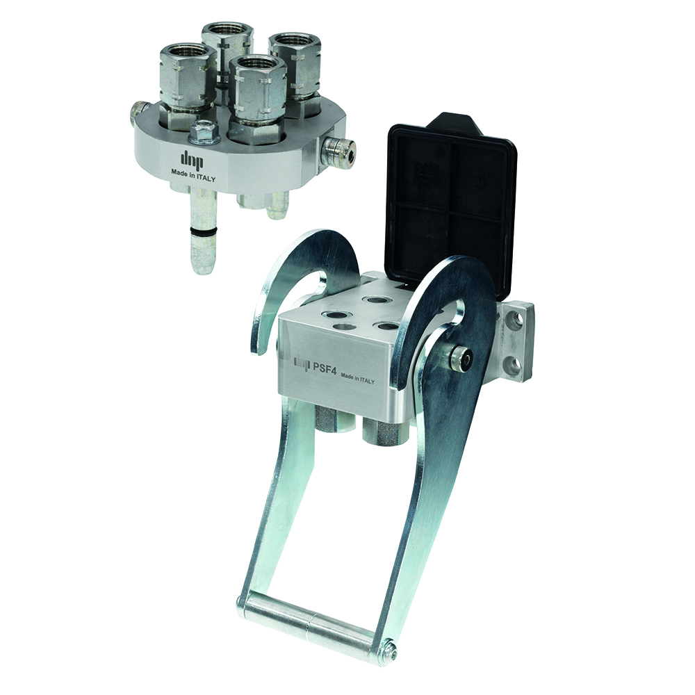 Die Multikupplung PSF von dnp wurde entwickelt um das Kuppeln unter Restdruck auf der Werkzeugseite zu ermöglichen. Die Kupplungsstecker erlauben das verbinden der Hydraulikleitungen bis zu einem Druck von 200bar! Die speziellen Dichtungen der Stecker sind für diese Anwendung ausgelegt.Die Verbindung der Hydraulikleitungen erfolgt über flachdichtende Kupplungselemente durch welche innerhalb kürzester Zeit mehrere Hydraulikleitungen miteinander verbunden oder getrennt werden. Dies geschieht mit einem Bedienhebel, dessen Führungskulisse so ausgelegt ist, dass die Bedienkräfte so gering wie notwendig gehalten werden. Die herausragenden Merkmale der Multikupplung sind die Verwechslungssicherheit der Anschlüsse, schnelle Verbindung, Kuppelbarkeit unter Restdruck sowie optimal minimierte Leckage während des Kuppelvorganges. Ein weiterer Vorteil ist die Austauschbarkeit mit der Faster Multikupplung P506. Es sind nicht nur die beiden Hälften des Multikupplers mit Faster P506 austauschbar, sondern auch die Stecker und Muffen. Baugruppe 2/DN10 Druck max. 250 bar Durchfluss max. 46 l/min Anschluss R1/2″IG