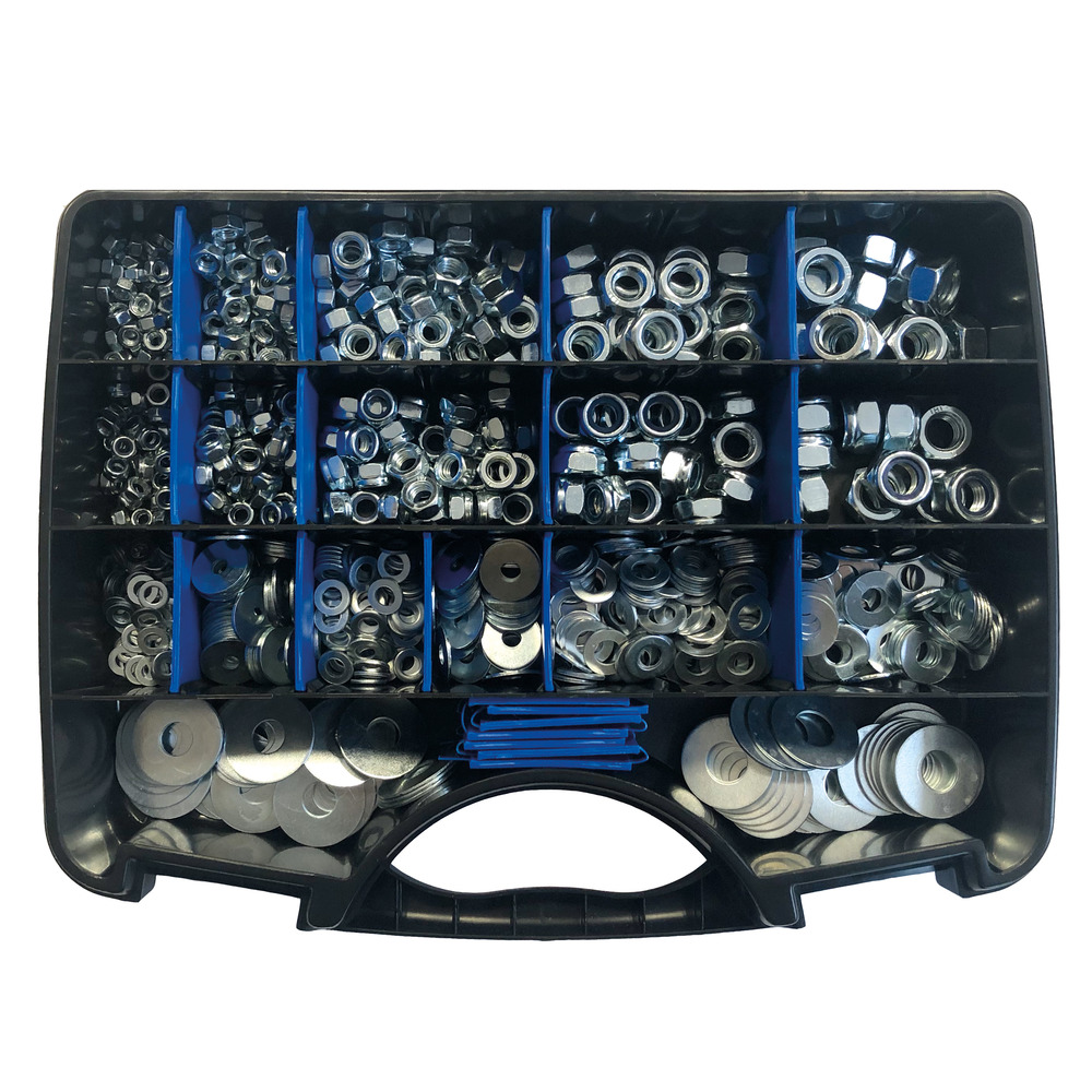 Umfangreiches, hochwertiges Set mit allen gängigen Muttern und Scheiben, in verzinkter Ausführung. Lieferung im stabilem Transportkoffer, mit Unterteilern - kein vermischen der verschiedenen Größen !Inhalt: DIN 934 6-kant Mutter: M5 / M6 / M8 / M10 / M12DIN 985 Sicherheitsmutter: M5 / M6 / M8 / M10 / M12 DIN 125 Unterlegscheibe M5 / M6 / M8 Karosseriescheiben: 5x20 / 6x20 / 8x20 / 10x30 / 13x30