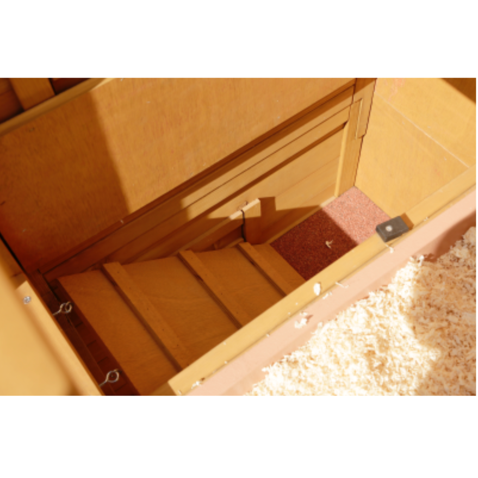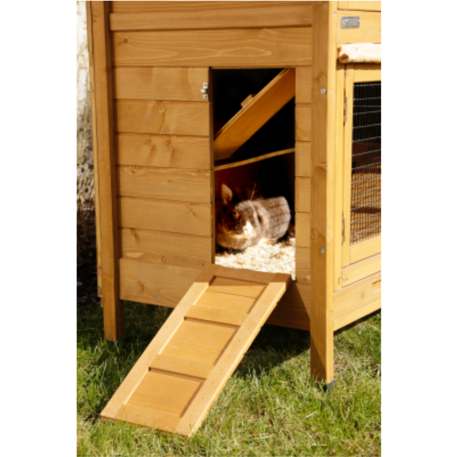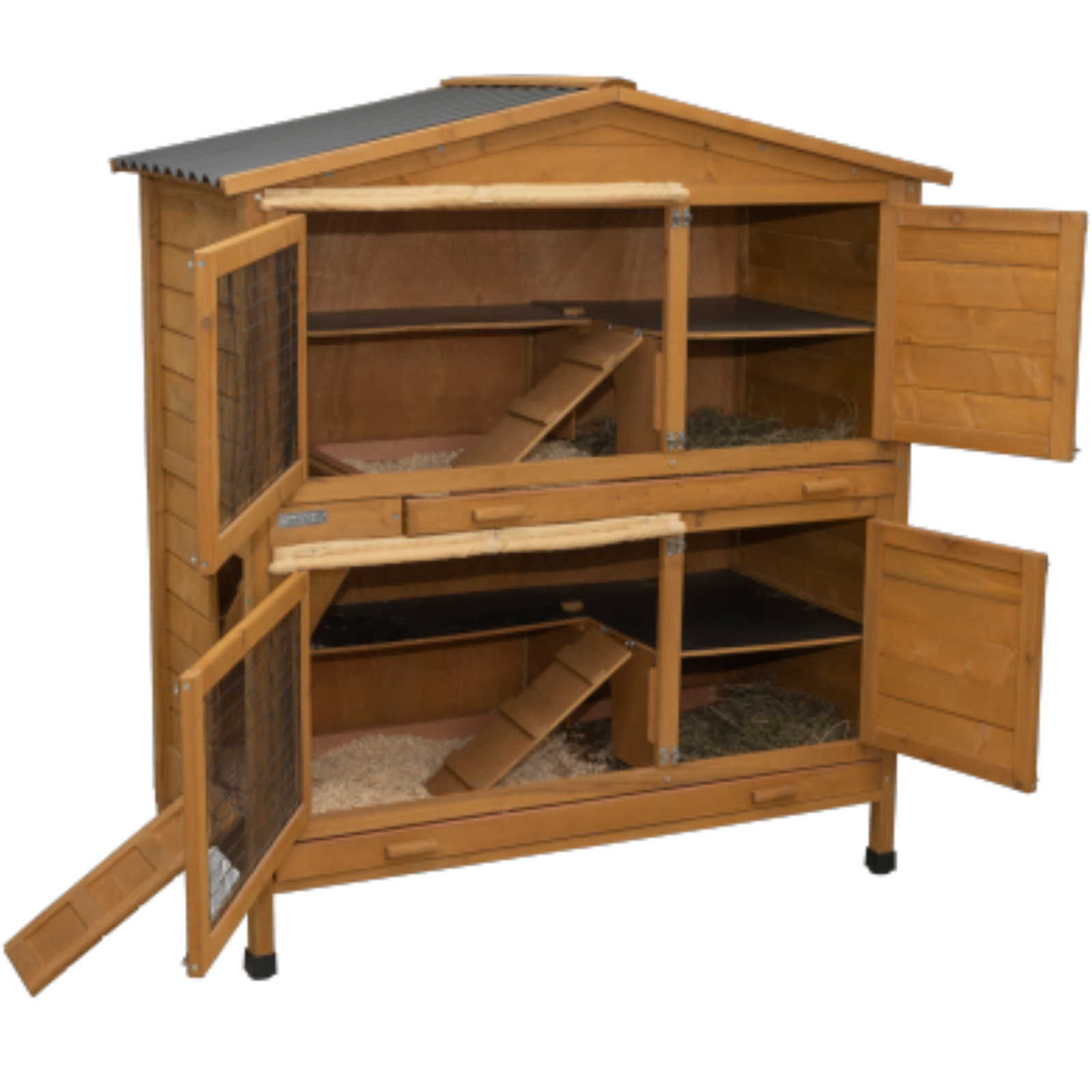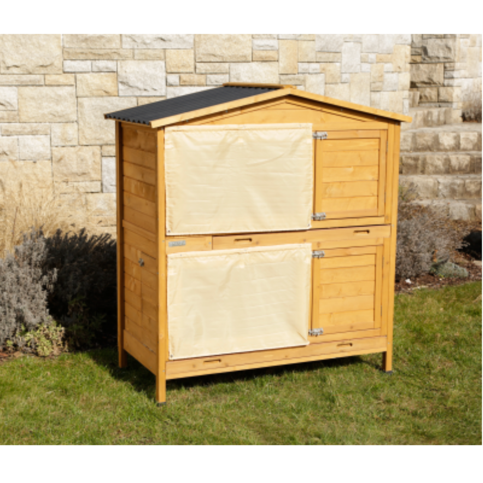 Durchdachtes Design für artgerechte HaltungWetterfestes Kunststoffdach schützt den Stall vor Regen und Witterung.Durchschlupf zum Ruhebereich sorgt für Rückzugsmöglichkeiten, während die seitliche Tür freien Auslauf ermöglicht.Maximale Sicherheit und BewegungsfreiheitZweiter Verschluss an jeder Tür erhöht die Sicherheit und schützt Ihre Tiere.Absperrmöglichkeit zwischen den Stockwerken erleichtert die Handhabung und die getrennte Nutzung.Zusätzliche kunststoffbeschichtete Etagen bieten mehr Bewegungsfreiheit und Abwechslung.Hygiene und Schutz vor FeuchtigkeitDie herausziehbare Kunststoffwanne mit 5 cm Höhe macht die Reinigung schnell und einfach.Höhenverstellbare Kunststofffüße schützen den Stall vor Bodenfeuchtigkeit und sorgen für Stabilität.Langlebig und einfach zu montierenGefertigt aus robustem lasiertem Holz mit Holzschutzfarbe und einer Front mit hochwertigem Gitter.Die einfache Montage mit Aufbauanleitung ermöglicht eine schnelle Inbetriebnahme. Lieferung erfolgt zerlegt im Karton.Maße:120 x 66 x 37 cm