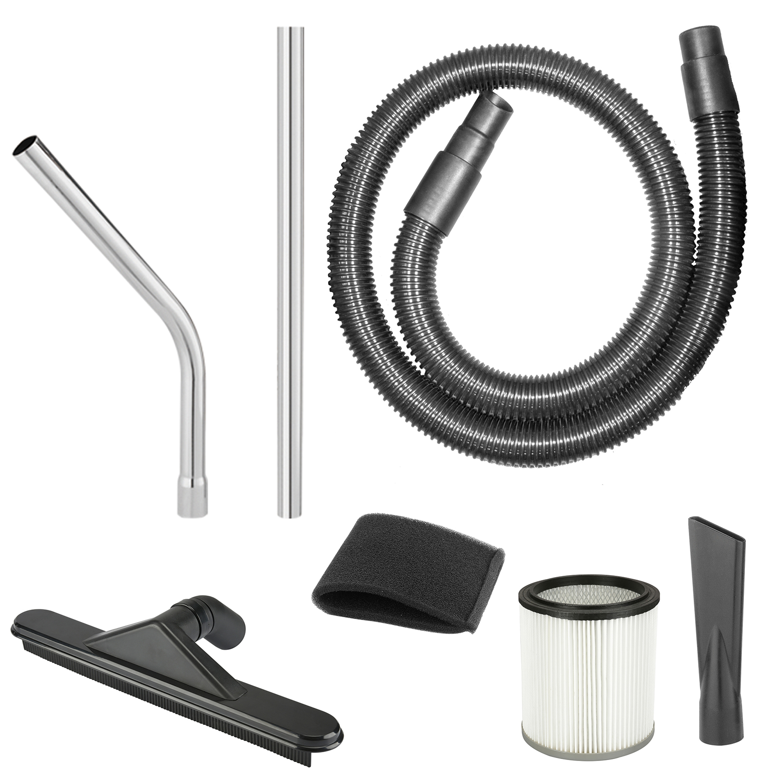 Lieferung mit 1x HEPA Filter, 1x Schaumstoffilter,1,5m Schaugschlauch 38 mm, Universaldüse sowie Metall Verlängerungsrohr.