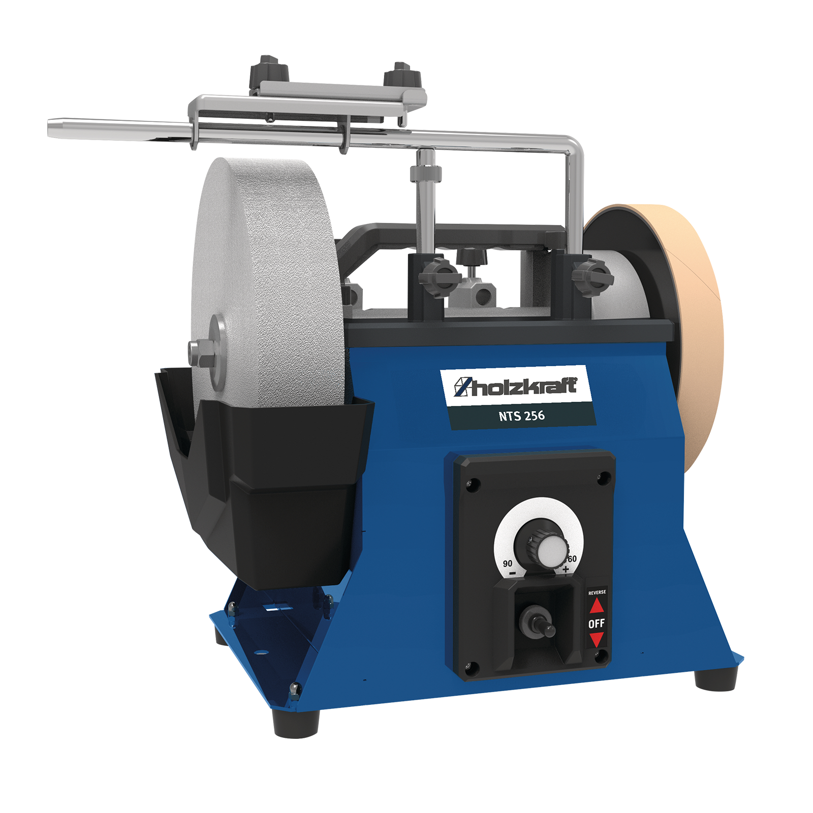 Die Lieferung erfolgt komplett mit Nass- und Abziehscheibe, Winkellehre, Universalschleifvorrichtung und Abziehpaste.
