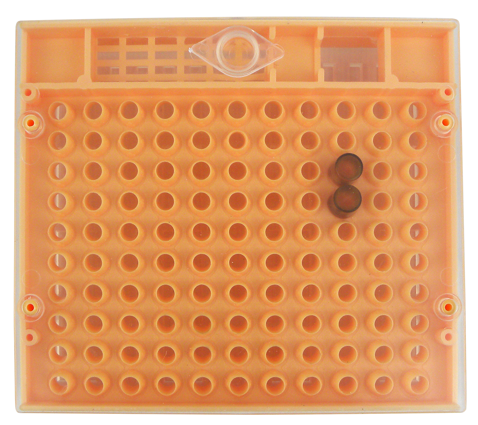 Anwendung: Absperrgitter und Schutzplatte entfernen, so die Zuchtkassette in ein leeres Rähmchen montieren. Weiselnäpfchen an die dafür vorgesehenen Plätze stecken. Schutzplatte verschließen und für 2 Tage ohne Absperrgitter in das Bienenvolk hängen. Tipp: Kunststoffkassette mit Wachs einschmieren, dadurch wird sie attraktiver für die Bienen. Nach dem sich die Bienen mit dem ´Fremdkörper´ vertraut gemacht haben, wird das Absperrgitter angebracht und die Königin durch das Schlupfloch zugesetzt. Nach weiteren 2 Tagen sind normalerweise die Näpfchen bestiftelt und können in den vorbereiteten Zuchtrahmen umgesteckt und anschließend in passende Pflegevölker gehängt werden.