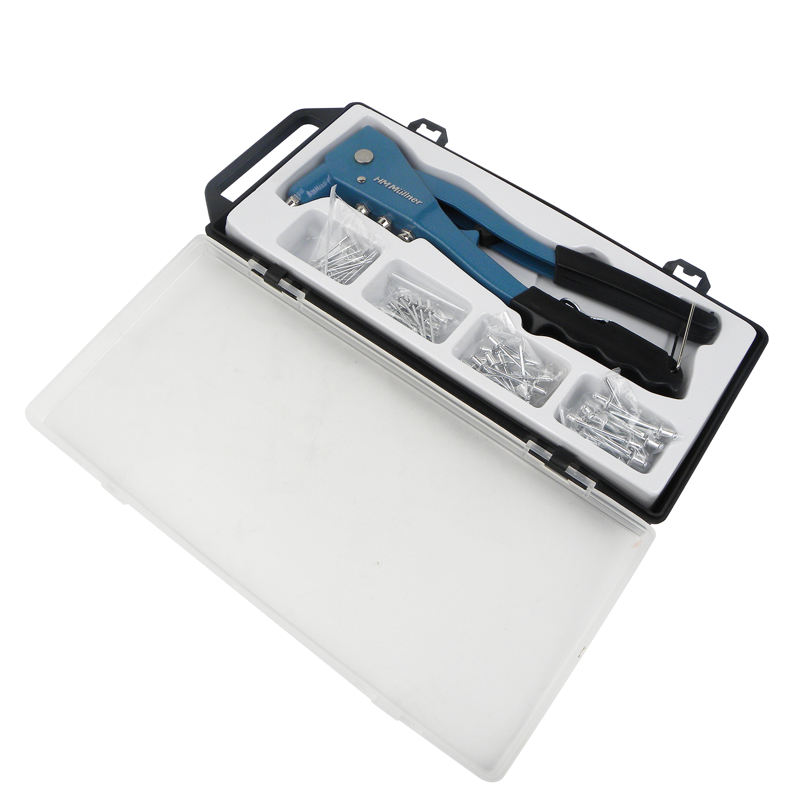 1 Stk. Blindnietzange, je 10 Stk. Alu Nieten 2,4 mm, 3,3 mm, 4 mm, 4,8 mm.