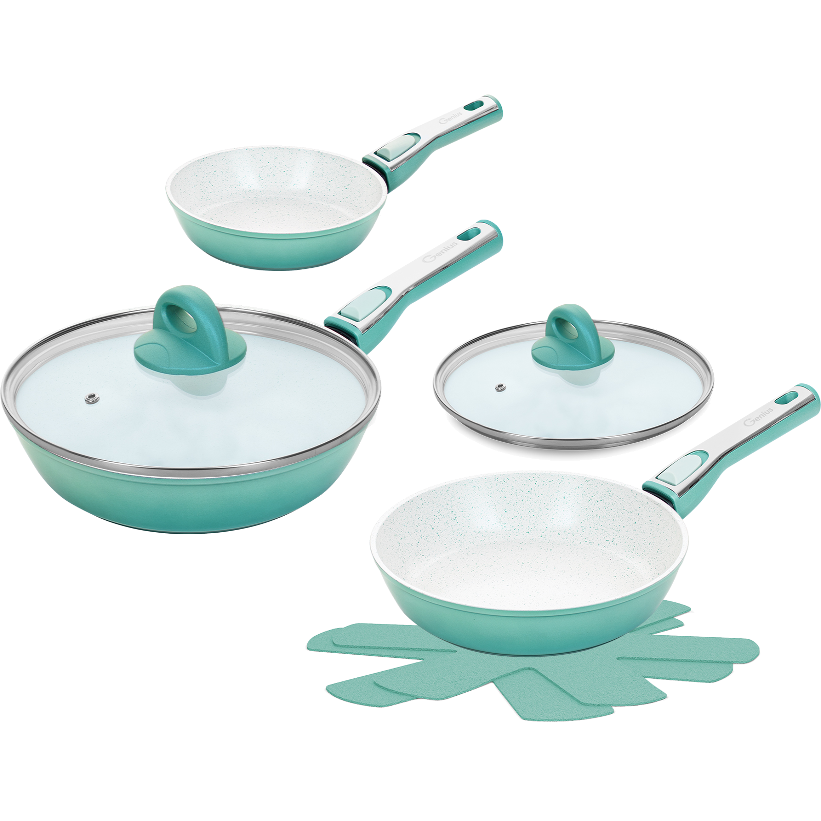 Set Inhalt:1 x Pfanne mit abnehmbarem Griff (⌀ 28 cm)1 x Pfanne mit abnehmbarem Griff (⌀ 24 cm)1 x Pfanne mit abnehmbarem Griff (⌀ 20 cm)1 x Design-Glasdeckel (⌀ 28 cm)1 x Design-Glasdeckel (⌀ 24 cm)2 x Vlies-Einleger
