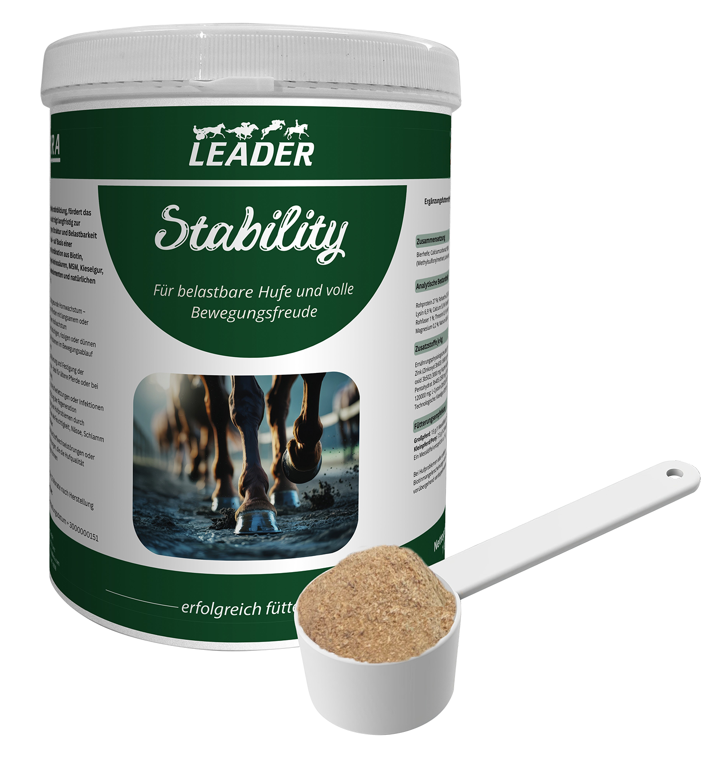 Leader Stability – Für starke Hufe und uneingeschränkte BewegungsfreudeKraftvolle Hufe – stabiles Fundament für Beweglichkeit, Wohlbefinden, Vitalität und Leistung.Leader Stability unterstützt gezielt das Huf- und Hornwachstum deines Pferdes – für mehr Stabilität, Elastizität und Widerstandskraft.Dank einer hochwertigen Kombination aus Biotin, Zink, Methionin, Vitaminen und Mineralstoffen fördert das Ergänzungsfuttermittel den natürlichen Aufbau und die Festigkeit der Hufe.Ideal bei erhöhter Beanspruchung, im Alter oder bei unregelmäßigem Hufwachstum.Vorteile auf einen Blick:Unterstützt gesundes Horn- und HufwachstumStärkt spröde, weiche oder rissanfällige HufeFördert die Hufstruktur bei starker Belastung oder längeren RuhephasenHilft bei Umwelteinflüssen wie Feuchtigkeit, Trockenheit oder harten BödenErgänzt die tägliche Fütterung bei unausgewogener NährstoffaufnahmeZusammensetzung:Bierhefe, Calciumcarbonat, MSM (Methylsulfonylmethan), Leinkuchen, DextroseFütterungsempfehlung:Großpferd: 15 g (1 Messlöffel) pro TagKleinpferd/Pony: 7,5 g (1/2 Messlöffel) pro TagEin Messlöffel entspricht ca. 15 gBei Hufproblemen oder anderen Biotinmangelerscheinungen kann die Dosis vorübergehend verdoppelt werden.Pulver unter das Kraftfutter mischen und leicht anfeuchten oder alternativ mit etwas Mashvermengen – erleichtert die Aufnahme und reduziert Staubbildung.Inhaltsstoffe:Rohprotein 27 %Rohfaser 1 %Rohfett 1,5 %Rohasche 25,5 %Calcium 5,8 %Phosphor 0,4 %Magnesium 0,2 %Natrium 0,06 %Lysin 6,9 %Methionin 12 %Threonin 0,5 %Zusatzstoffe pro kg:Biotin 2000000 μgZink (Zn-Oxid) 13600 mgMangan (Mn-Oxid) 3000 mgKupfer (Cu-Sulfat) 2500 mgDL-Methionin 120000 mgL-Cystein 15000 mgTechnologischeKieselgur 40000 mg
