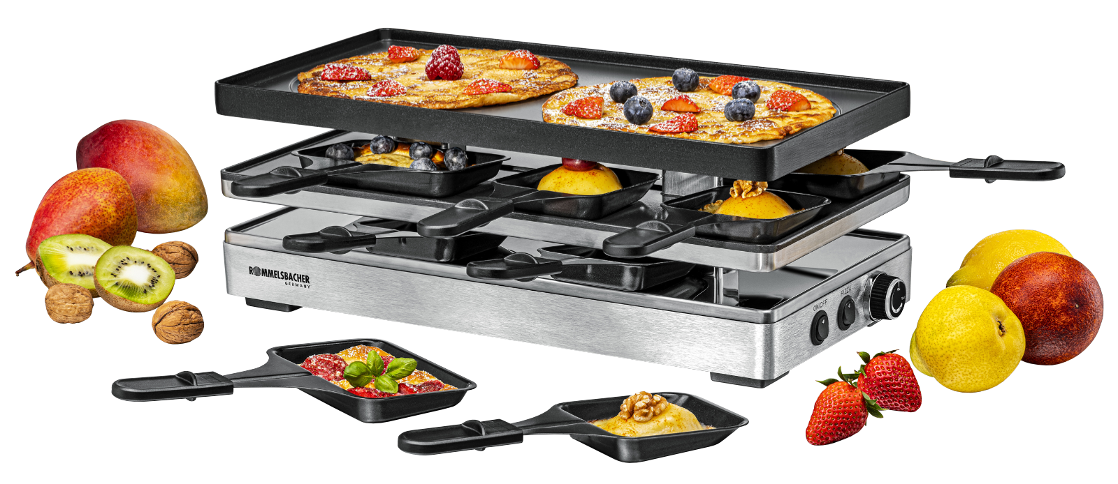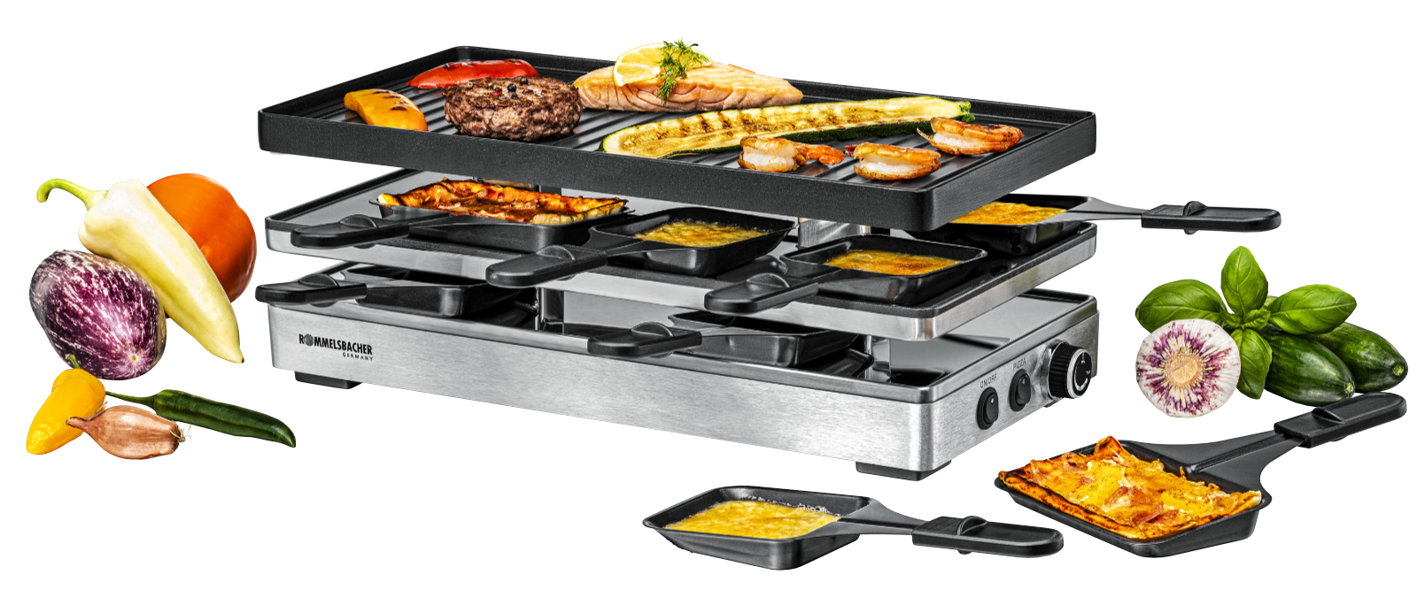 - - als Raclette Grill mit 8 Pfännchen, als Pizza-Station (mit Unterhitze) für 6 Pfännchen,