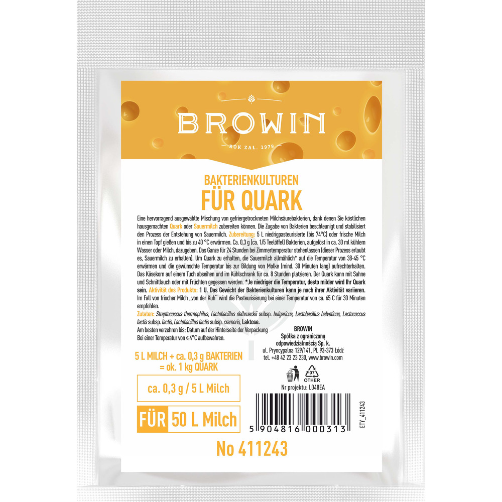 5 Liter niedrigpasteurisierter (bis 74°C) oder frischer Milch in einen Topf gießen und bis zu 40 °C erwärmen. Ca. 0,3 g (ca. 1/5 Teelöffel) Bakterien, aufgelöst in ca. 30 ml kühlem Wasser oder Milch, dazugeben. Das Ganze für 24 Stunden bei Zimmertemperatur stehenlassen (dieser Prozess erlaubt es, Sauermilch zu erhalten). Die gesäuerte Milch langsam* bis zur Temperatur von 38-45 °C erwärmen und die gewünschte Temperatur bis zur Bildung von Molke ( 30 Minuten lang) aufrechterhalten. Das Käsekorn auf einem Tuch abseihen und im Kühlschrank für ca. 8 Stunden platzieren. Der Quark kann mit Sahne und Schnittlauch oder mit Früchten gegessen werden.