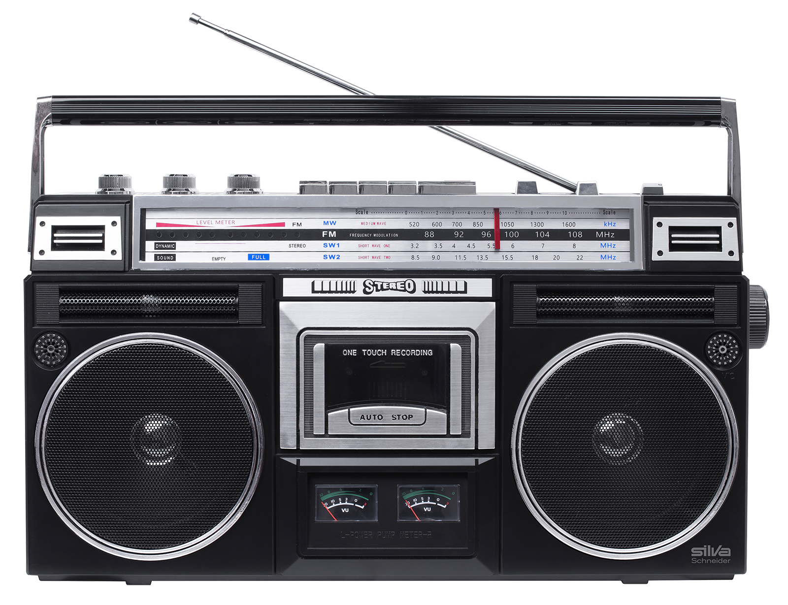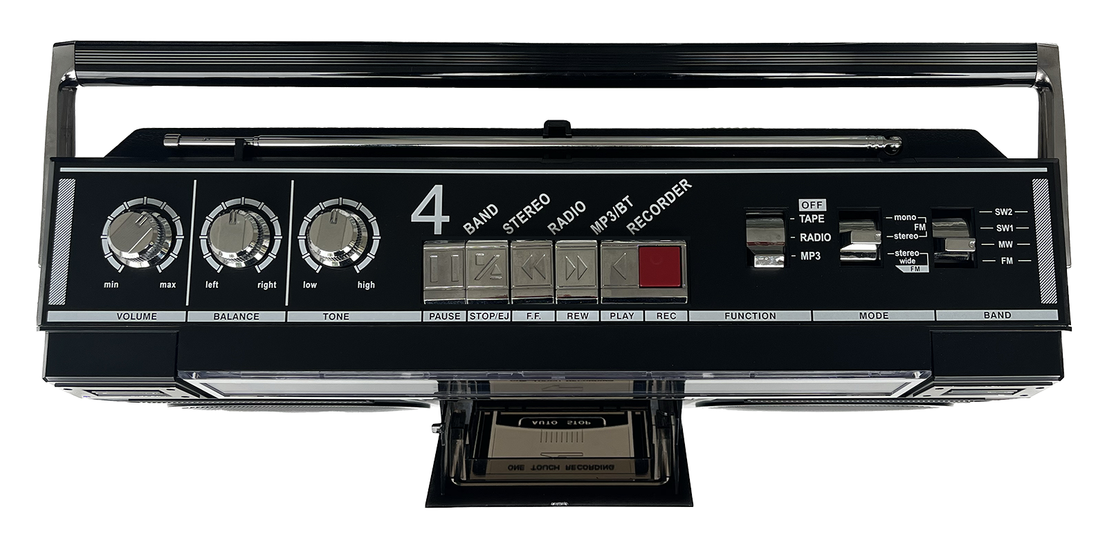 One-Touch Recording auf Kassette Recording auf USB / MP3 (Überspielen Sie ihre Kassette auf MP3) 4-Band-Radio:UKW- / MW- /2 x KW Radio Balance- + Klangregler ausziehbare Antenne Weitere Wiedergabemöglichkeiten: Bluetooth USB / TF-Karte Sonstiges: 80 Watt P.M.P.ONetz- /Batterieberieb (6 x D / R 20)2 manuelle VU-Metereingebautes Mikrophon Anschlüsse: Kopfhörer 3,5 mmUSBMicro-TF-Kartenleser9-12 V DC Maße: B/H/T: 43 x 23,4 x 11,3 cm