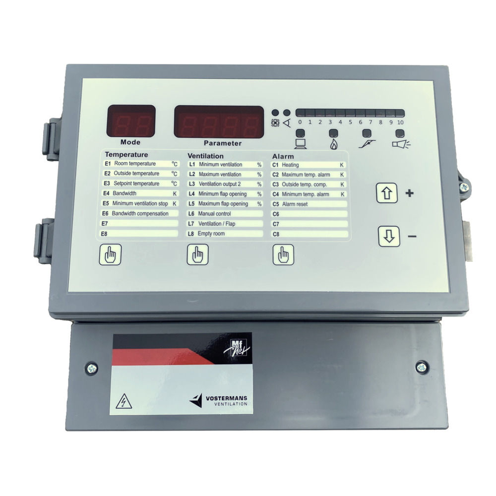 Reglertyp Triac-Regler, 230 V einphasig, Lüfter Ausgangsspannung 70-230 V, Lüfter Ausgangsstrom 0,5-6,3 A, IP54 Kunststoffgehäuse, Eingänge: Temperatursensor, Ausgänge: Ventilationsregler (6,3 A), 0-10 Volt für Lufteinlässe oder zusätzliche Regler. LxBxH: 205 x 235 x 120 mm