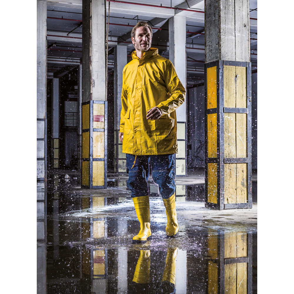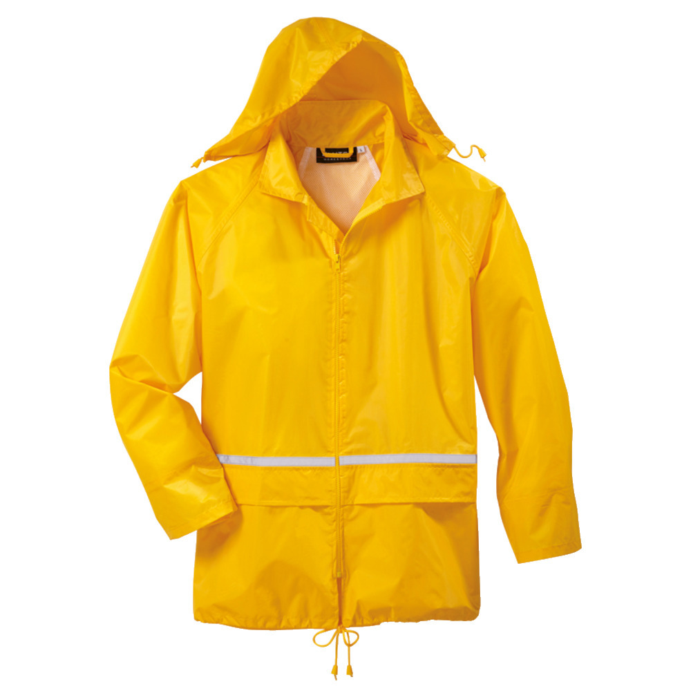 Wasserdicht, winddicht, Reflektoren vorne und hinten für zusätzliche Sicherheit. Einrollbare Kapuze, Lüftungssystem am Rücken, Lüftungslöcher in den Armen, Bund regulierbar, Ärmelbündchen innen mit Gummizug und 2 Fronttaschen. Material: 100 % Polyester mit PVC-Beschichtung (REACH-konform). Größe: S-3XL.
