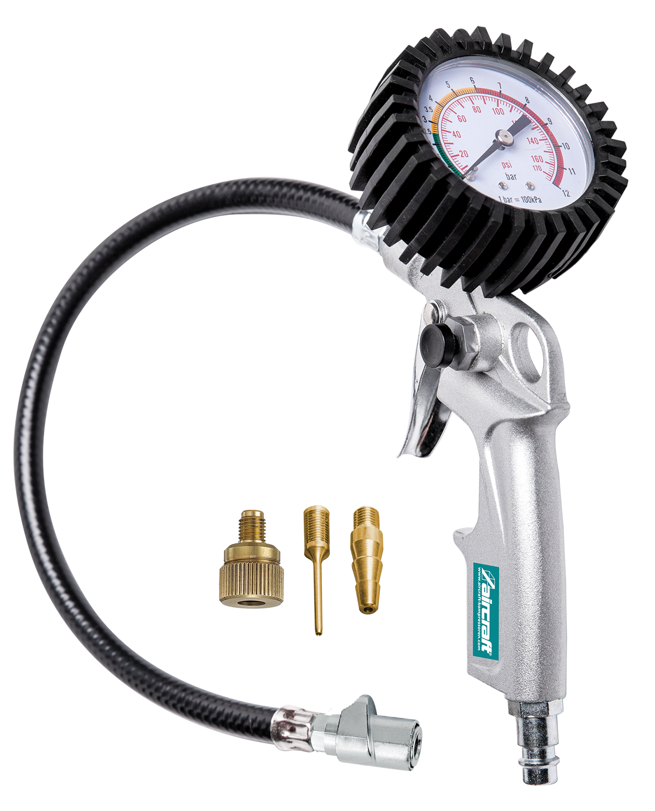 Reifenfüll Set mit praktischem Quick Lock Moment Stecknippel mit patentiertem Mechanismus für sicheren Halt am Verntil, sowie rasches An- und Abstecken.Inkl. 3 teiligem Adapter Set: Fahrradventiladapter, Düse schmal und breit für Bälle, Schlauchboote, Luftmatratzen, etc.Technische Daten: