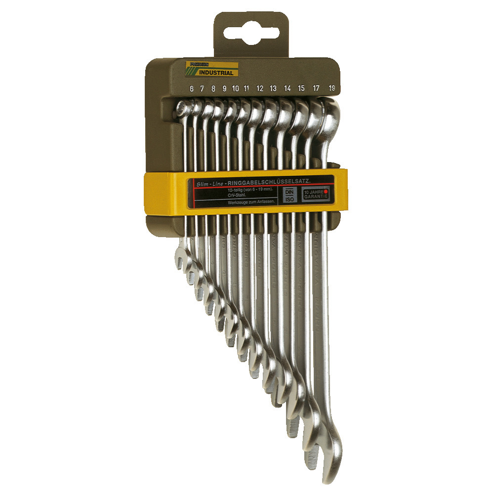 Hochwertige Kombischlüssel in den Größen 6, 7, 8, 9, 10, 11, 12, 13, 14, 15, 17, 19 auf praktischem Kunststoffhalter mit Bohrung für Wandbefestigung.