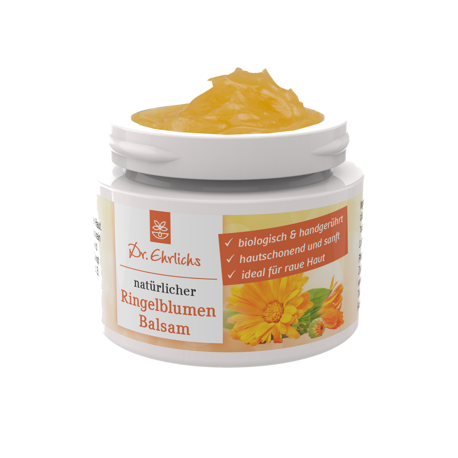 Die pflegende Kraft der Ringelblume für beanspruchte HautDie Anwendungsgebiete der Ringelblume sind äußerst vielfältig.Der Ringelblumen Balsam besteht ausschließlich aus naturreinem Ringelblumenöl aus biologischem Anbau und wertvollem Bienenwachs.Die Rezeptur ist hoch konzentriert und frei von Füll- und Zusatzstoffen.Der Ringelblumen Balsam kann bei unreiner Haut, Blutergüssen, Windeldermatitis, Insektenstichen, Pickeln,Quetschungen, Warzen und Zerrungen sowie zur Pflege beanspruchter Haut angewendet werden.Inhalt: 30 ml<Anwendung:Ideale Pflege, auch bei empfindlicher Haut und rauen Stellen, z. B. an Händen, Füßen,Ellenbogen.Hinweis:Nicht anwenden bei einer Überempfindlichkeit oder bestehenden Allergie gegenRingelblume/Calendula oder andere Korbblütengewächse.Inhaltsstoffe:Olea Europaea Fruit Oil* (Olivenöl), Cera Alba (Bienenwachs), Calendula Officinalis FlowerExtract* (Ringelblumenextrakt), Tocopherol* (natürliches Vitamin E)*Rohstoffe aus kontrolliert biologischem Anbau.