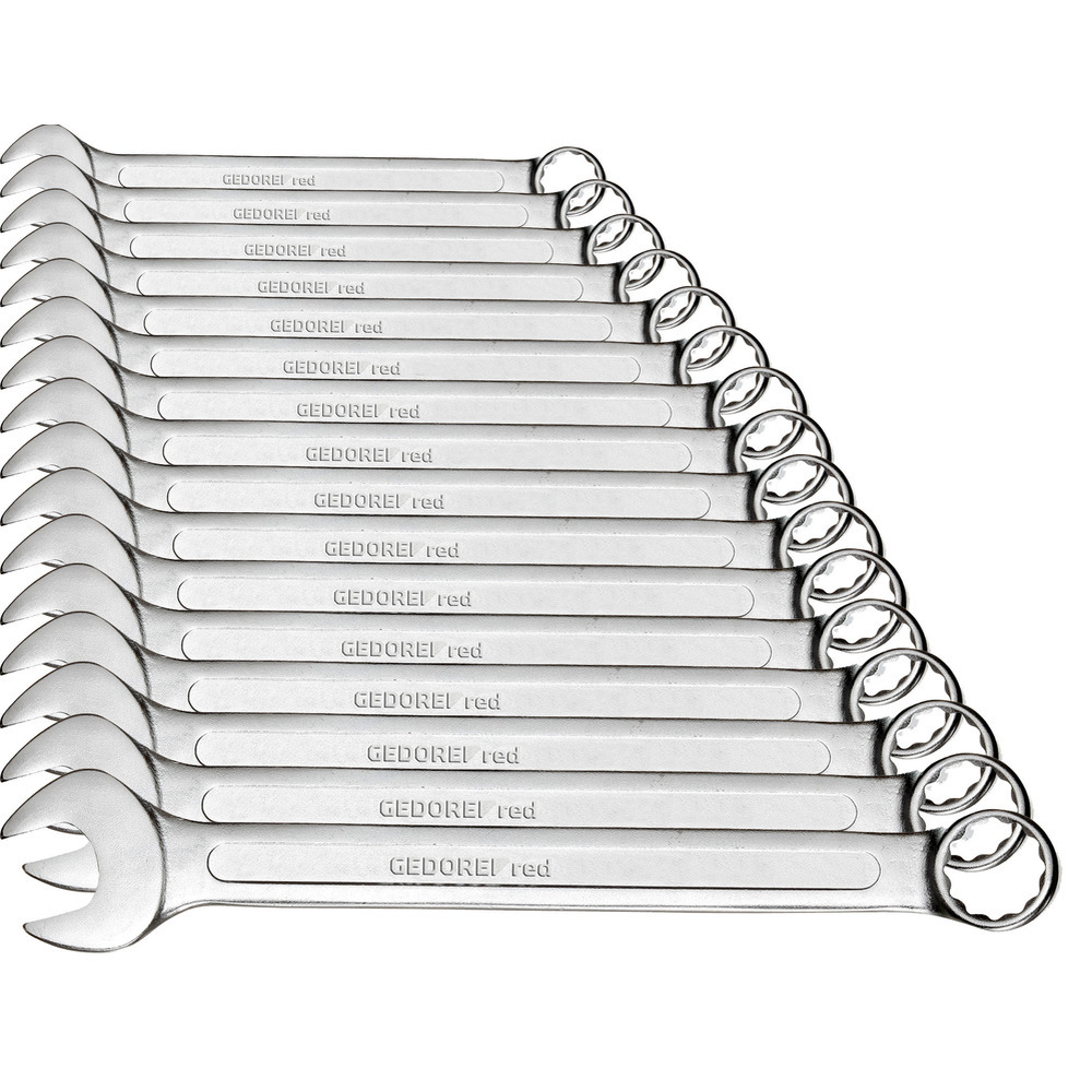 Ringseite abgewinkelt 15°. Maulstellung 15°. Chrom-Vanadium-Stehl. Oberfläche matt-satiniert verchromt. Im Halter.Inhalt: 1/4,5/16,3/8,7/16,1/2,9/16,5/8,11/16,3/4,13/16,7/8,15/16,1,1.1/16,1.1/8,1.1/4 Zoll.