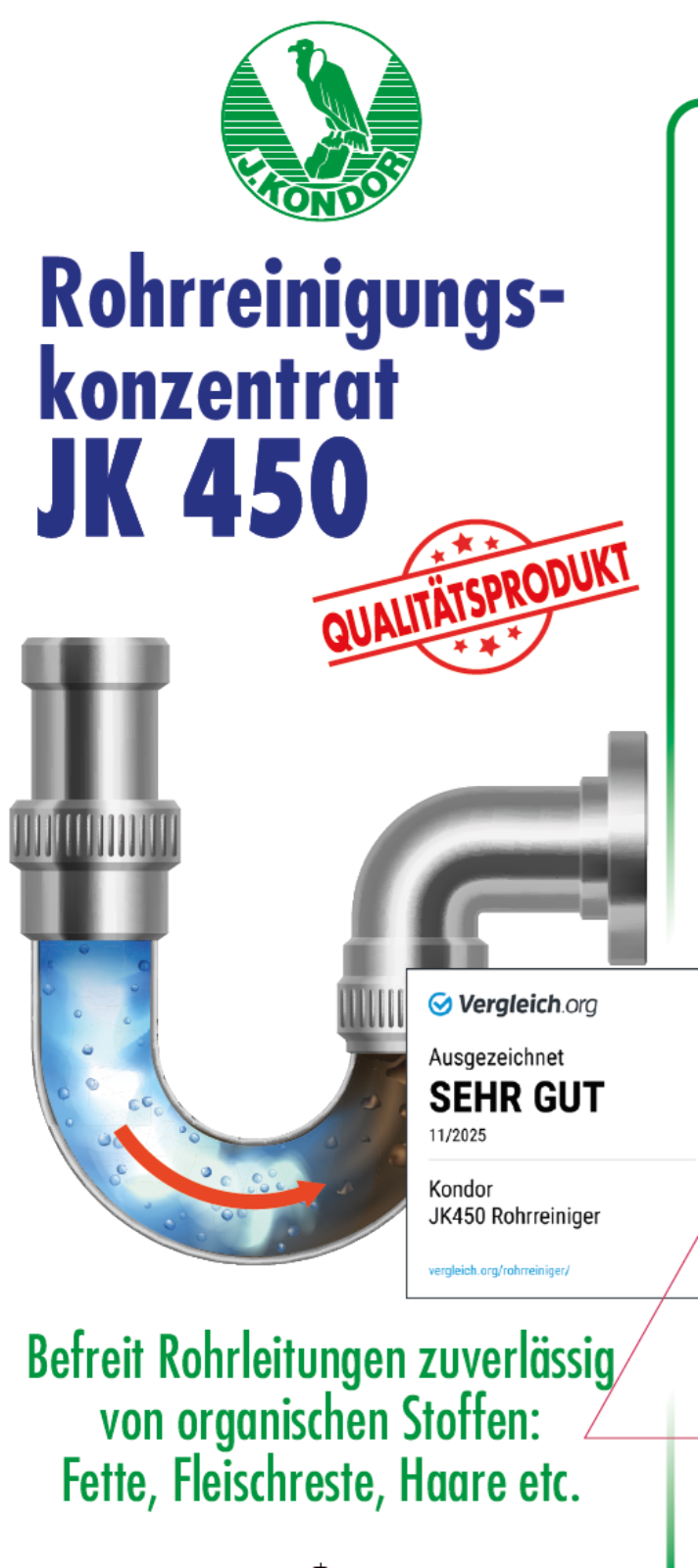 Rohrreinigungskonzentrat JK450befreit mühelos Rohrleitungen von organischen Stoffen wie Fette, Fleischreste, Haare, usw., Gefrieren und Bodensatzbildung, beeinträchtigen nicht die Qualität.Kein Angriff auf Dichtungen, Metall und Kunststoffrohrleitungen. Registrierungsnummer beim Umweltbundesamt unter 200400.Anwendung:1 Teil JK450, 2 Teile heißes Wasser einwirken lassen (mind. 15-30 min.) und nachspülen. Verarbeitung bei Raumtemperatur. Nicht auf Marmor oder Armaturen verwenden.Gefahrenhinweise:Verursacht schwere Verätzungen!Sicherheitsratschläge:Unter Verschluss und für Kinder unzugänglich aufbewahren. Bei der Arbeit nicht essen und trinken. Bei Berührung mit den Augen sofort gründlich mit Wasser abspülen und Arzt konsultieren. Bei der Arbeit geeignete Schutzhandschuhe und Schutzbrille, Gesichtsschutz tragen. Bei Unfall oder Unwohlsein sofort Arzt zuziehen (wenn möglich Etikett vorzeigen). Nur im Originalgebinde verschlossen aufbewahren.