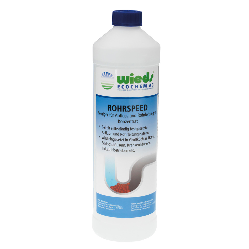 Konzentrierter Rohr Reiniger zur Stoßbehandlung und vorbeugenden Wartung. Beseitigt wirkungsvoll organische Rückstände wie zum Beispiel Haare.Die organischen Stoffe, wie Fette, Haare, Zellstoff und Hygieneartikel werden hierbei aufgelöst und das Rohr ist schnell und effektiv frei von Verstopfungen.Dabei ist Rohrspeed unschädlich für Kunststoffe, Blei, Eisen, Gummidichtungen und Metalle.Leichte Handhabung und schnelle Wirksamkeit in der konzentrierten Literflasche.Seit Jahren bewährt in zB Krankenhäusern, Schlachthöfen, der Landwirtschaft, Industrie und Gewerbe - mit dem kräftigem Alleskönner sind Verstopfungen passé !ROHRSPEED sicher verwenden.Vor Gebrauch stets Kennzeichnung und Produktinformation lesen.Gefahrenhinweise:H314 Verursacht schwere Verätzungen der Haut und schwere Augenschäden.H290 Kann gegenüber Metallen korrosiv sein.Sicherheitshinweise:P101 Ist ärztlicher Rat erforderlich, Verpackung oder Kennzeichnungsetikett bereithalten.P102 Darf nicht in die Hände von Kindern gelangen.P260 Rauch nicht einatmen.P264 Nach Gebrauch Hände gründlich waschenP280 Schutzhandschuhe/ Augenschutz tragen.P301 + P330 + P331 BEI VERSCHLUCKEN: Mund ausspülen. KEIN Erbrechen herbeiführen.P303 + P361 + P353 BEI BERÜHRUNG MIT DER HAUT (oder dem Haar): Alle kontaminierten Kleidungsstücke sofort ausziehen. Haut mit Wasser abwaschen/duschen.P305 + P351 + P338 BEI KONTAKT MIT DEN AUGEN: Einige Minuten lang behutsam mit Wasser spülen. Vorhandene Kontaktlinsen nach Möglichkeit entfernen. Weiter spülen.P310 Sofort GIFTINFORMATIONSZENTRUM oder Arzt anrufen.P405 Unter Verschluss aufbewahren.P501 Inhalt/Behälter industrieller Verbrennungsanlage zuführen.Enthält: Natriumhydroxid, unter 5 % anionische Tenside.