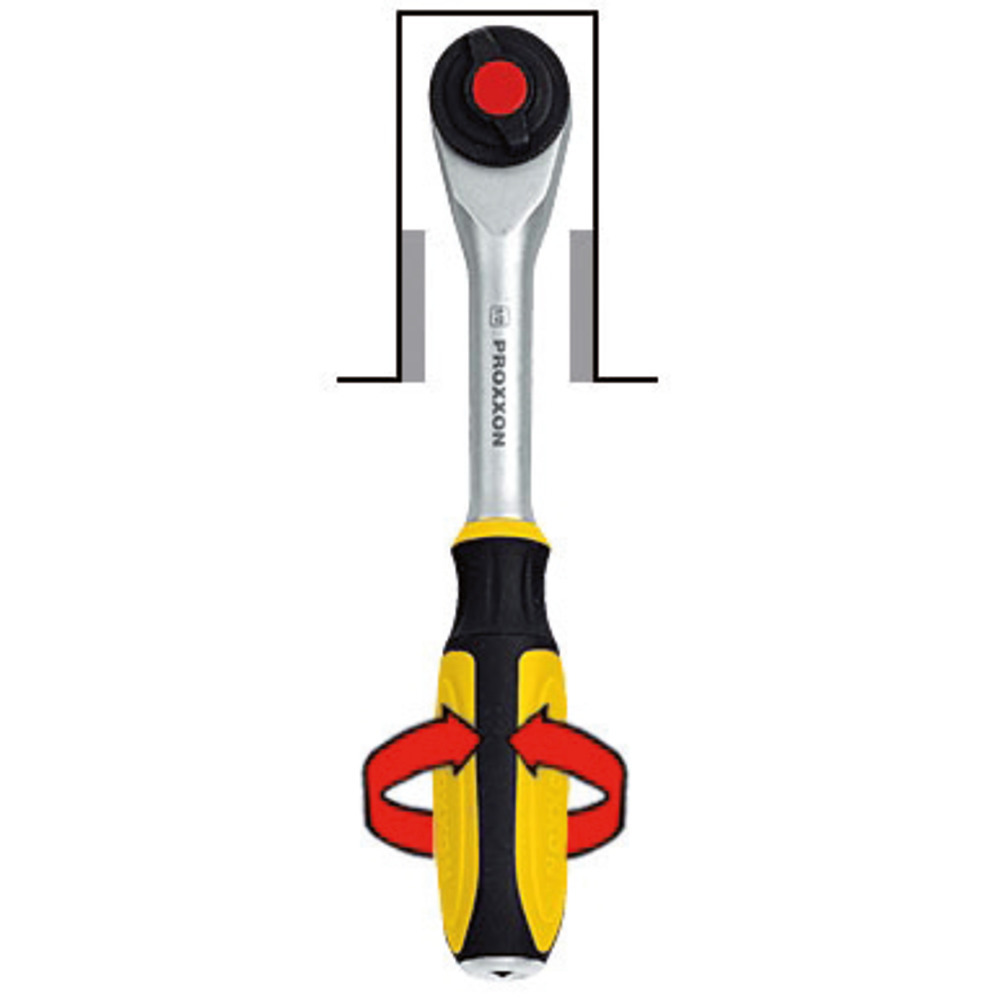 Hochwertige Umschaltknarre mit zusätzlicher Winkelschraubfunktion. Durch feinverzahntes Getriebe ( 52 Z) einfaches Lösen oder Festziehen bei engen Platzverhältnissen. Die Schraubarbeit wird bequem und rasch durch das Drehen des Griffes erledigt.